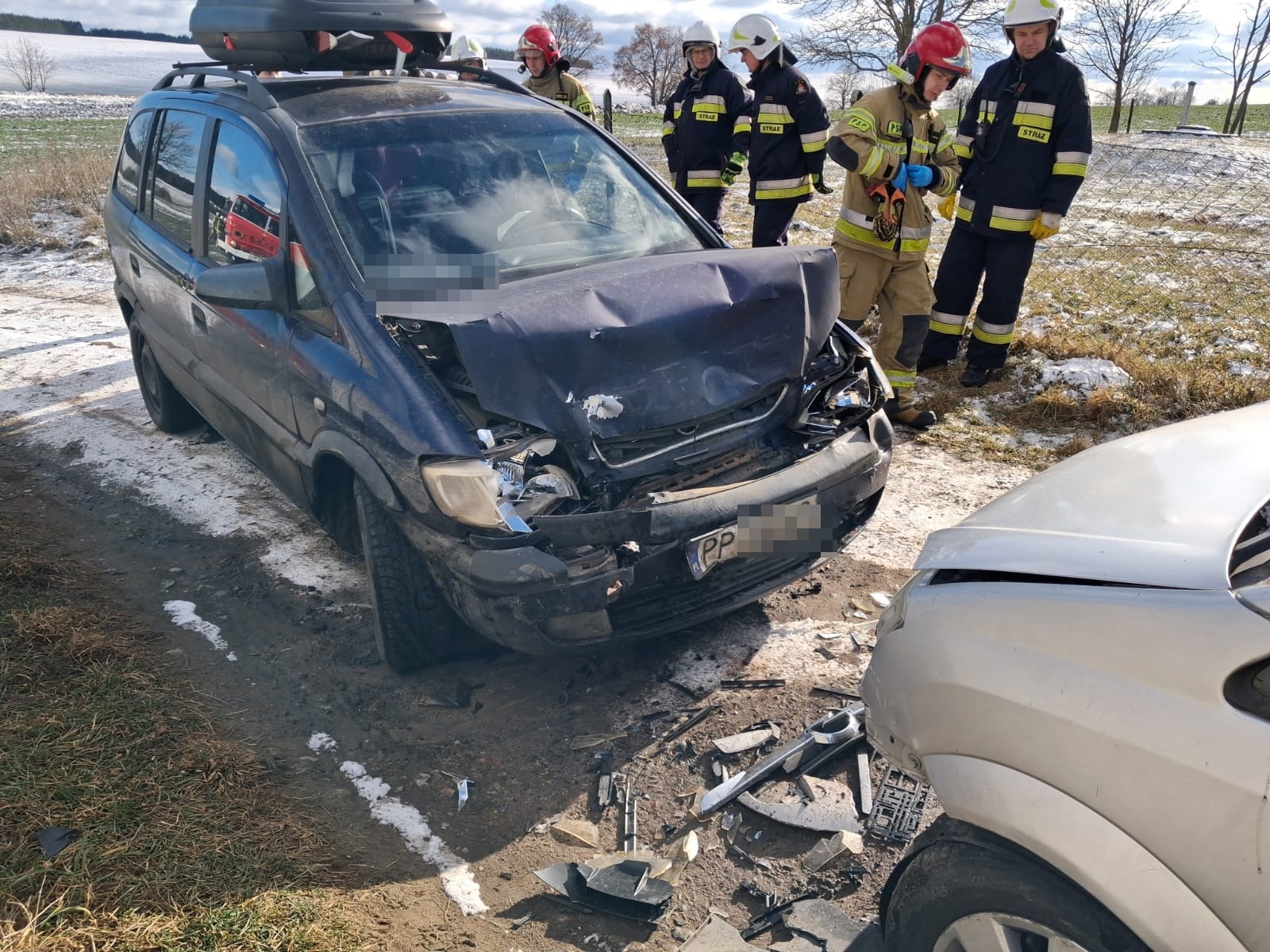 Po przyjeździe pierwszych zastępów straży pożarnej na miejsce zdarzenia okazało się, że na drodze gruntowej zderzyły się czołowo dwa samochody osobowe.