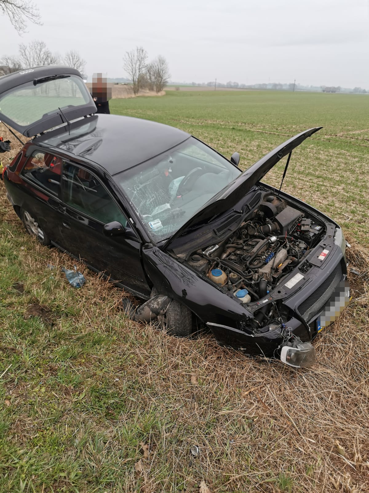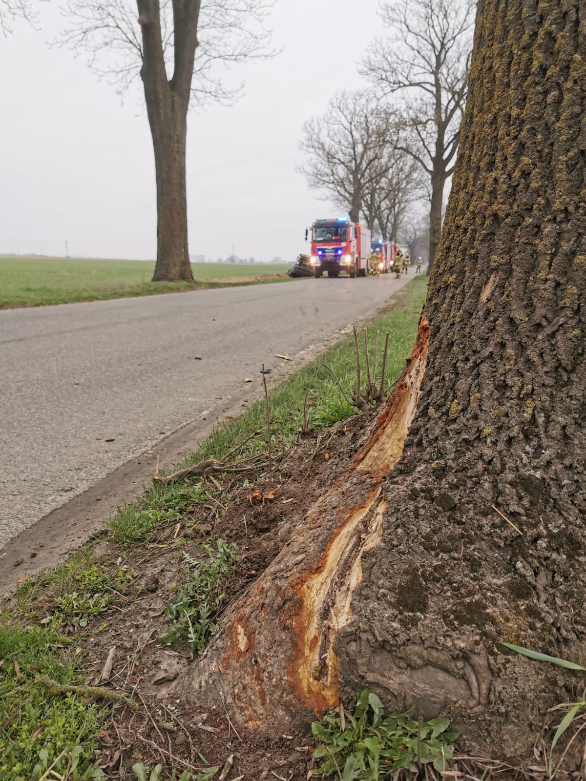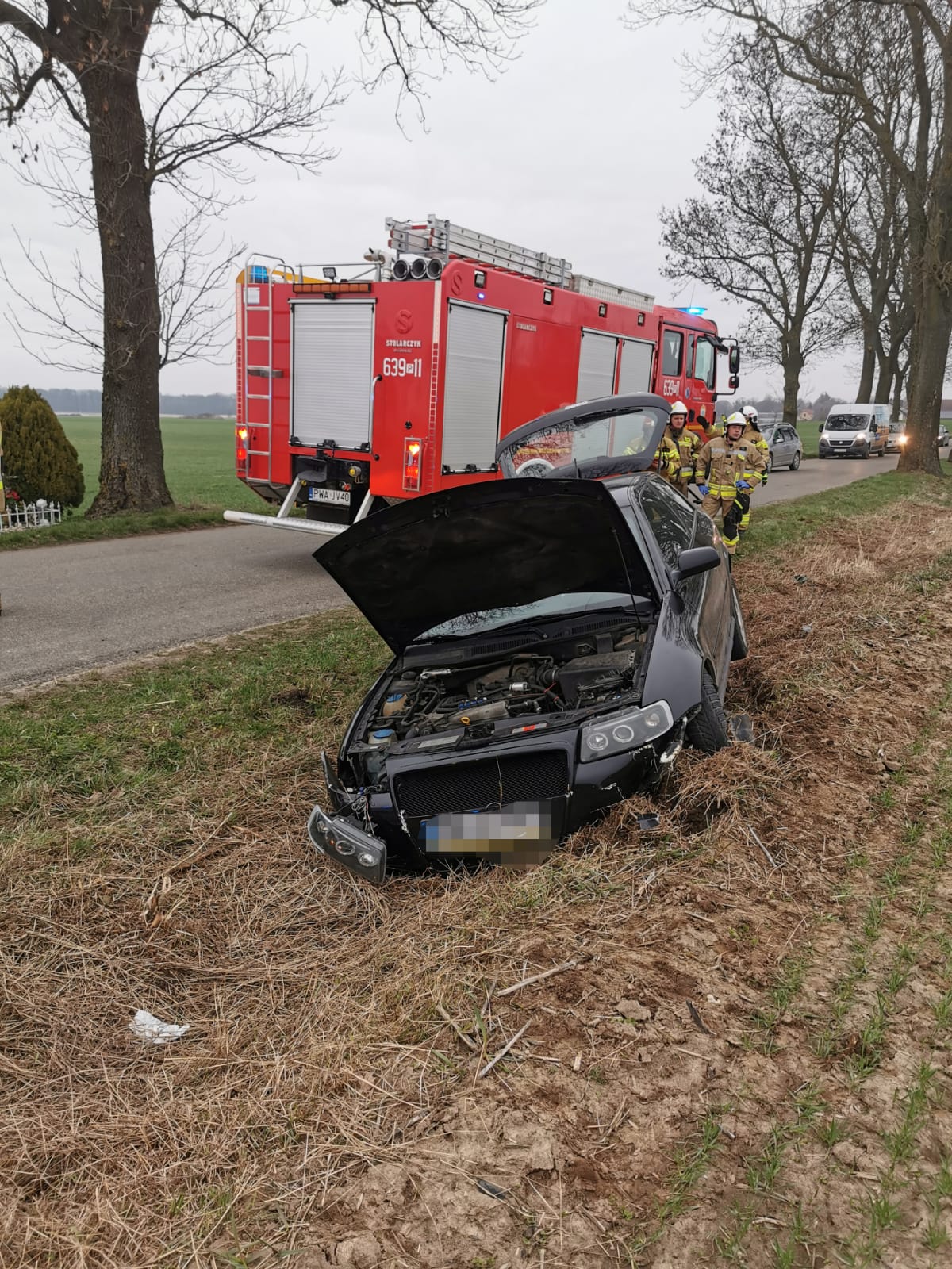 Po dojeździe pierwszych zastępów straży pożarnej okazało się, że samochód osobowy uderzył w drzewo i wypadł z drogi. Osoba kierująca opuściła pojazd o własnych siłach i nie zgłasza dolegliwości zdrowotnych.