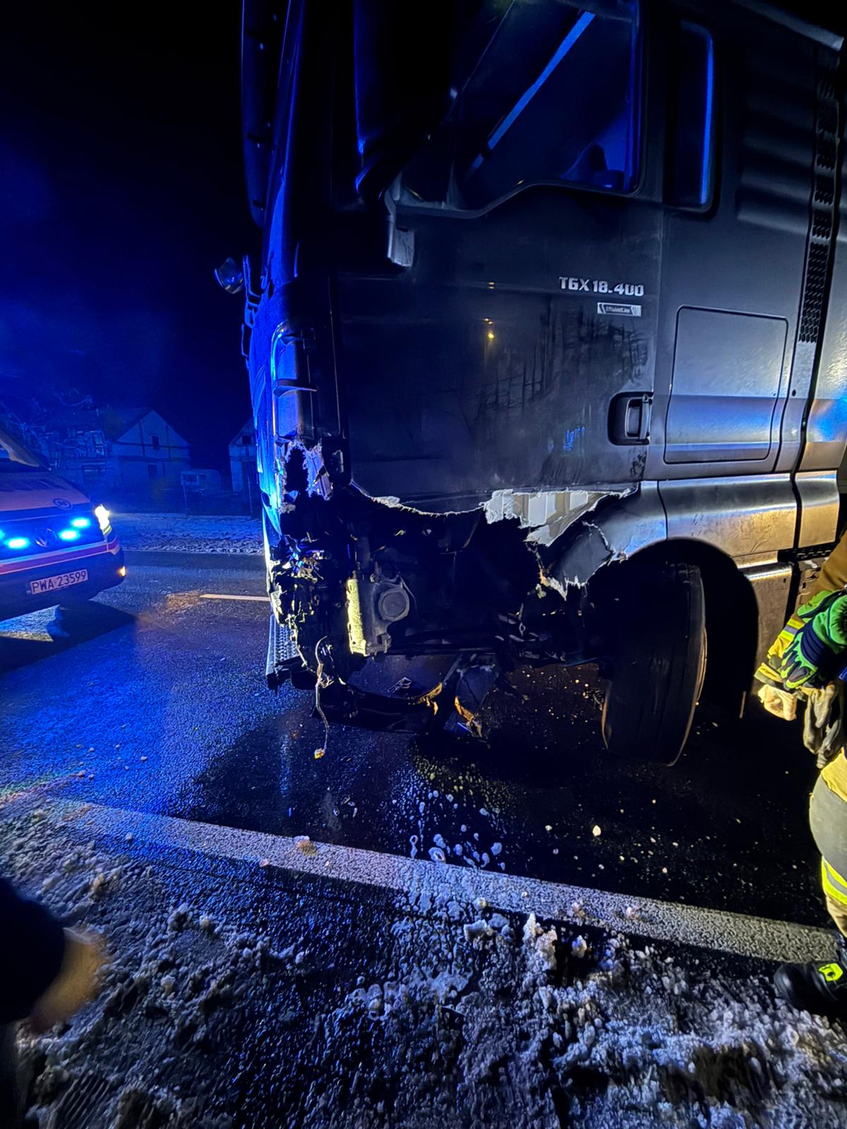 Strażacy usunęli z jezdni wyciekłe płyny eksploatacyjne przy użyciu sorbentu, a na czas czynności dochodzeniowych oświetlali miejsce zdarzenia.