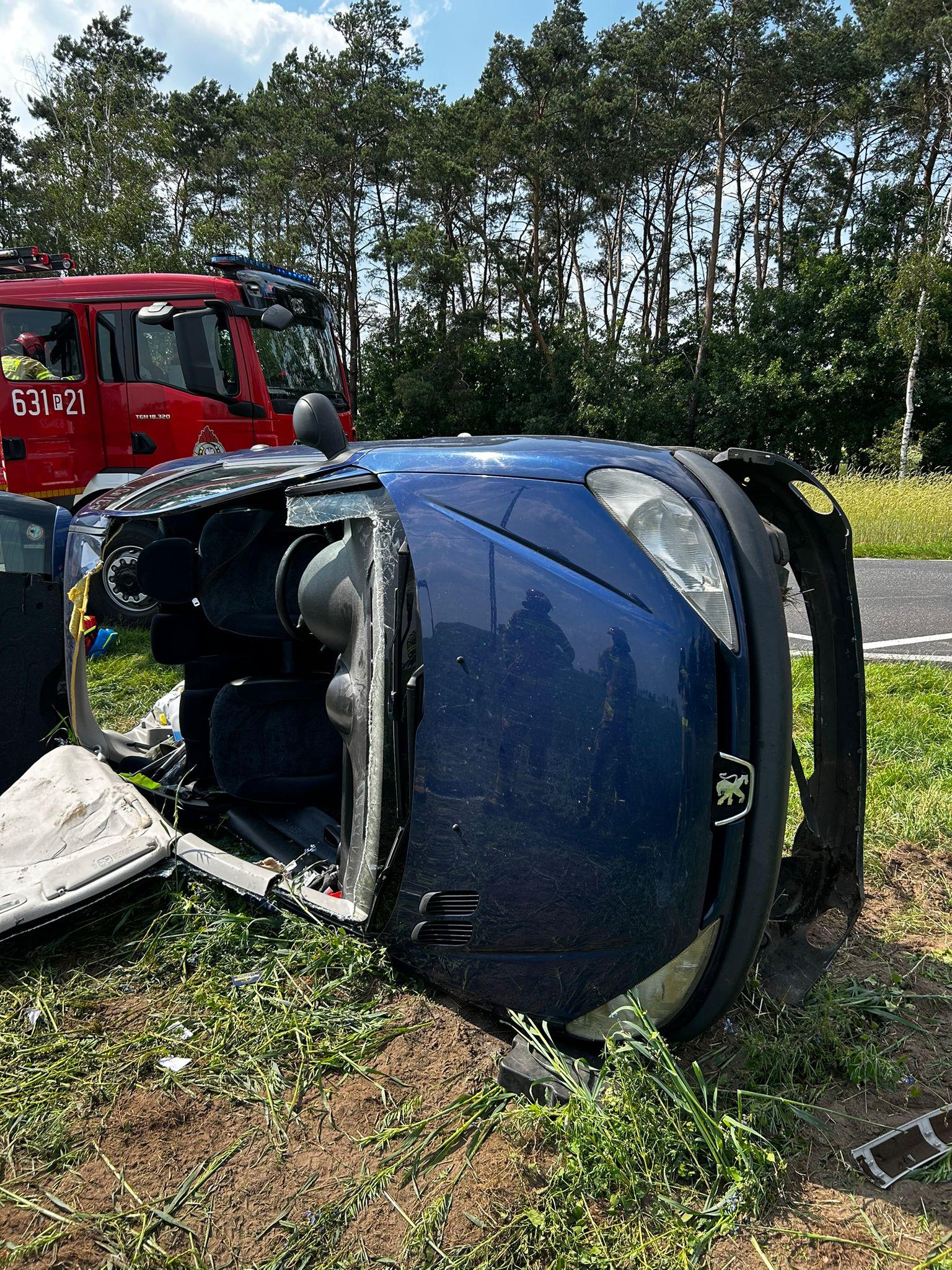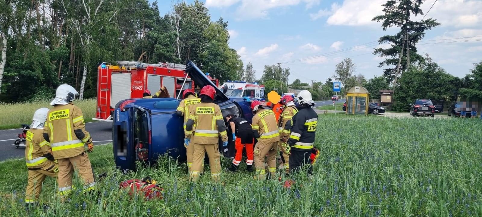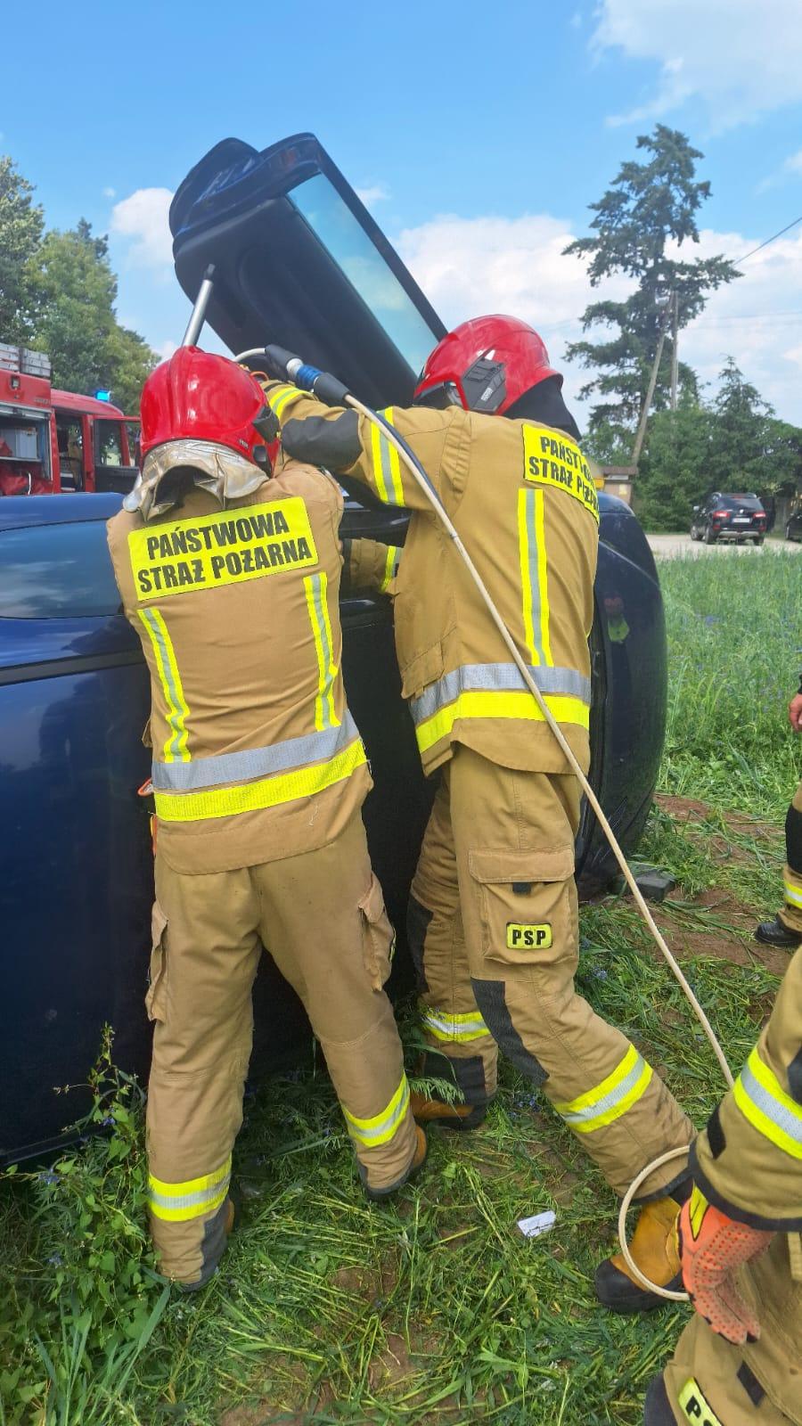 W czasie przyjazdu zastępów straży pożarnej na miejsce zdarzenia samochód osobowy znajdował się przewrócony na prawy bok, a osoba kierująca znajdowała się wewnątrz pojazdu w dolnej jego części