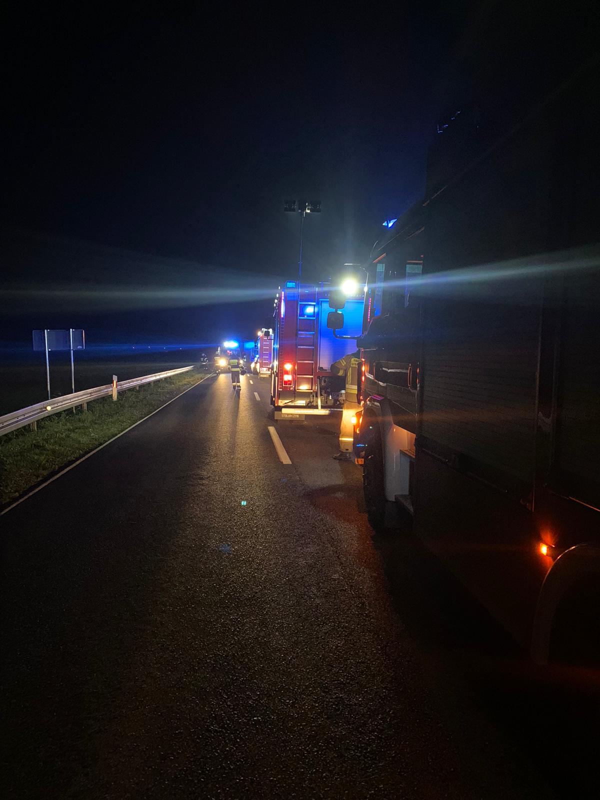 Ze zgłoszenia wynikało, że ranne zostały dwie osoby - kierowcy pojazdów, a z samochodu ciężarowego wycieka płyn eksploatacyjny do pobliskiego rowu. W momencie dojazdu na miejsce zdarzenia pierwszych zastępów straży pożarnej droga wojewódzka była całkowicie zablokowana, a na miejscu obecny był już Zespół Ratownictwa Medycznego oraz patrol Policji.