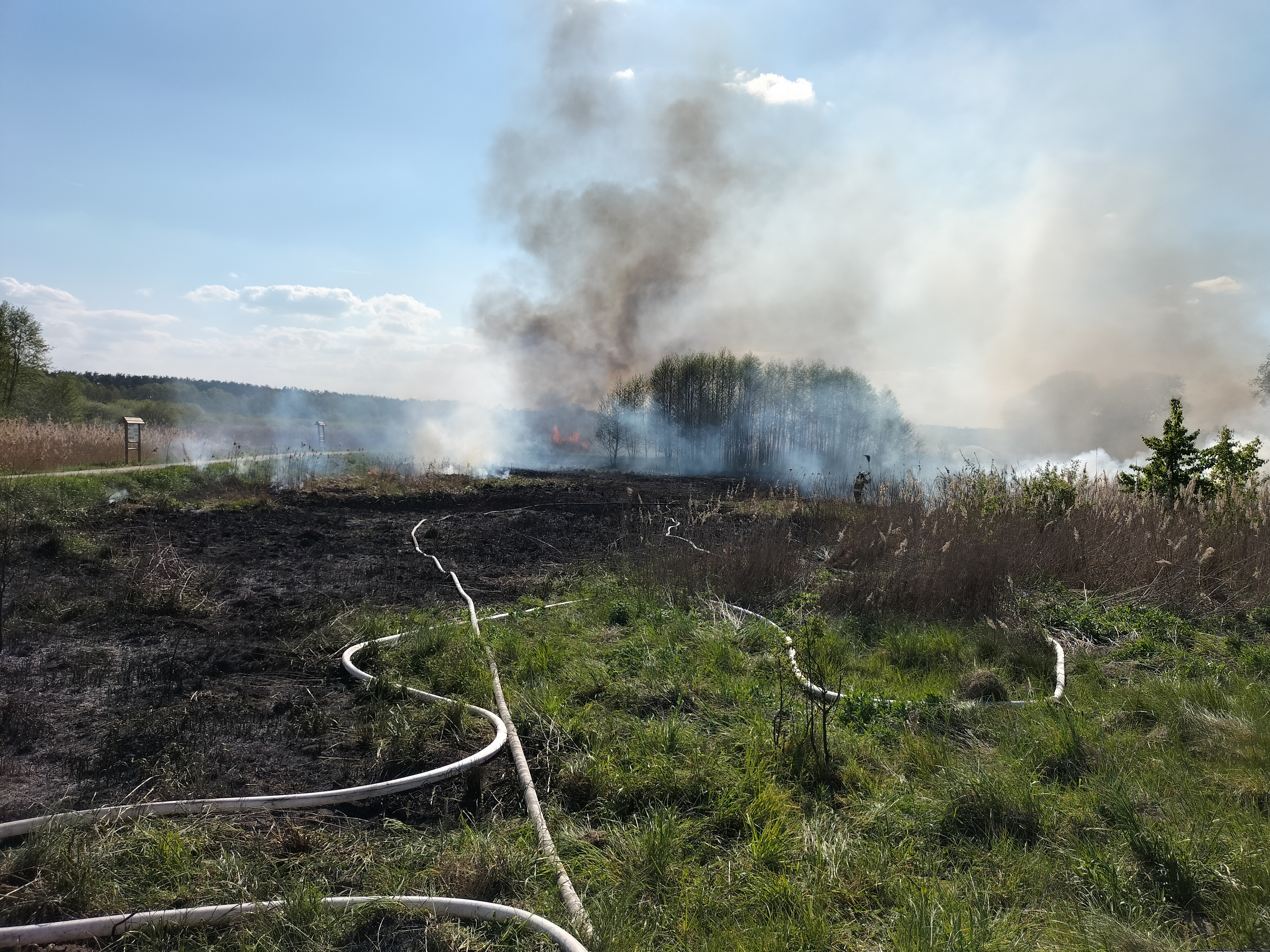 Po dojeździe pierwszych zastępów straży pożarnej potwierdzono informację, ze zgłoszenia o pożarze kilkudziesięciu metrów. Niestety podmuch porywistego wiatru sprawiły, że ogień na suchej trawie i trzcinach zaczął bardzo szybko się rozprzestrzeniać. Do działań skierowane zostały kolejne zastępy straży pożarnej.