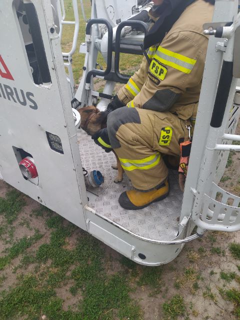 Kiedy na miejsce przybył pierwszy zastęp Straży Pożarnej okazało się, że pies znajduje się na drzewie na wysokości około 20 metrów.