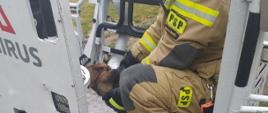 Działania straży pożarnej polegały na zabezpieczeniu miejsca zdarzenia oraz zdjęciu psa, z drzewa przy pomocy drabiny mechanicznej SCD-30.