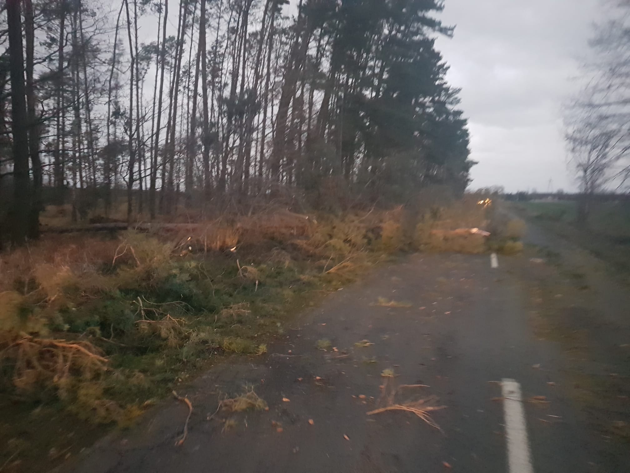 Silnie wiejący wiatr przewracał drzewa na drogi publiczne, uszkadzał dachy budynków mieszkalnych i gospodarczych, a także zrywał linie energetyczne powodując, niejednokrotnie, przerwy w dostawach prądu.