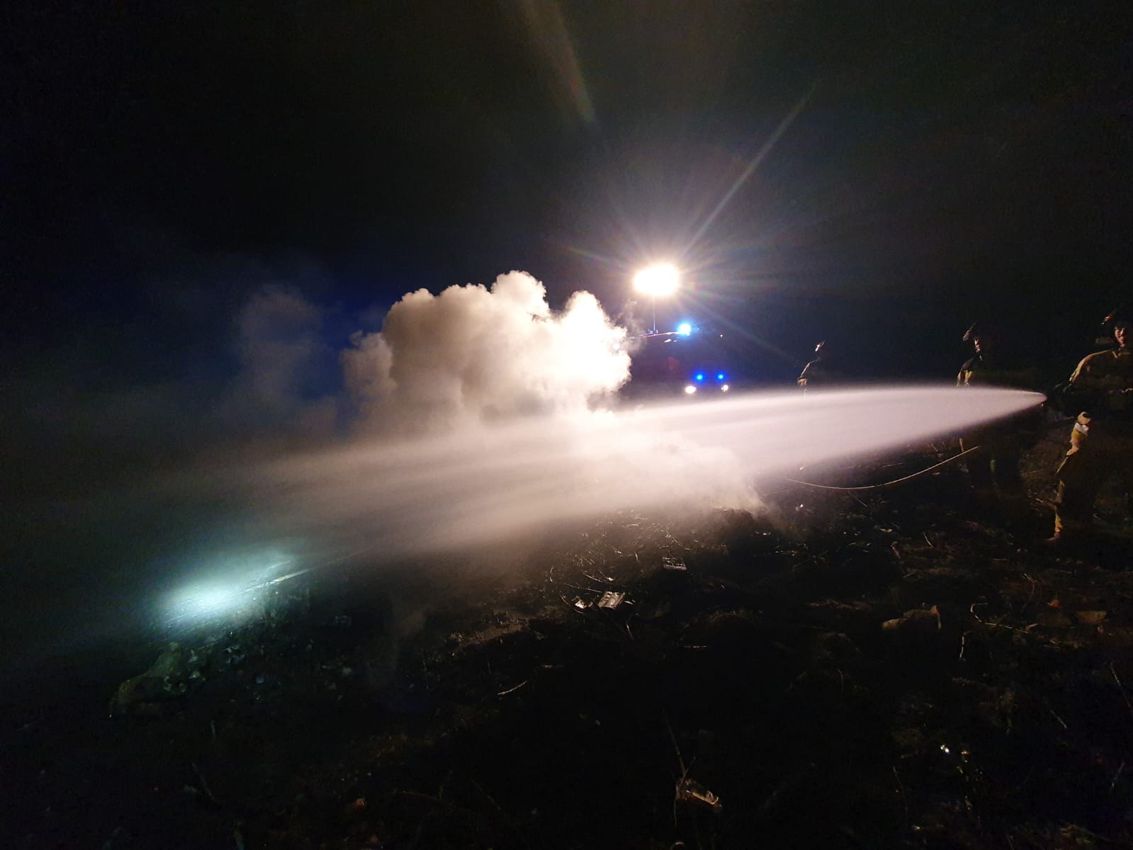 Działania straży pożarnej polegały na zabezpieczeniu miejsca zdarzenia, podaniu jednego prądu wody w natarciu na palące się składowisko części.