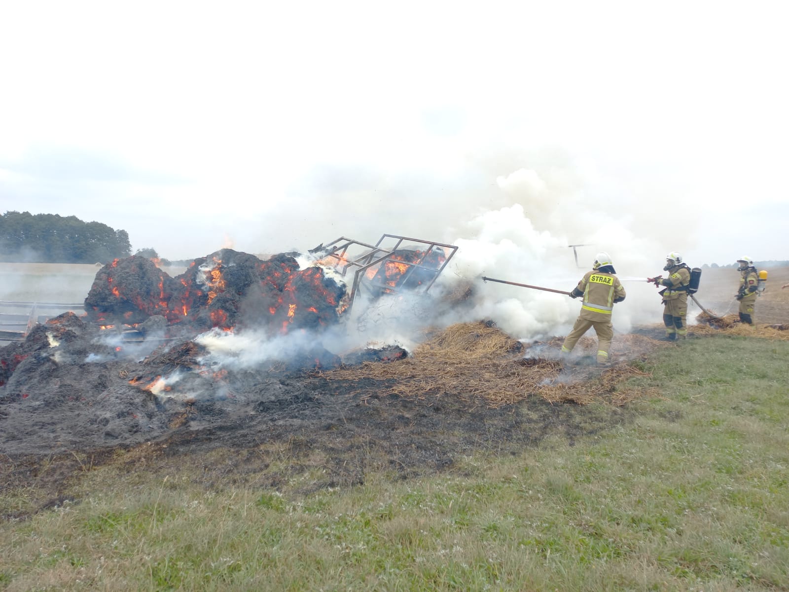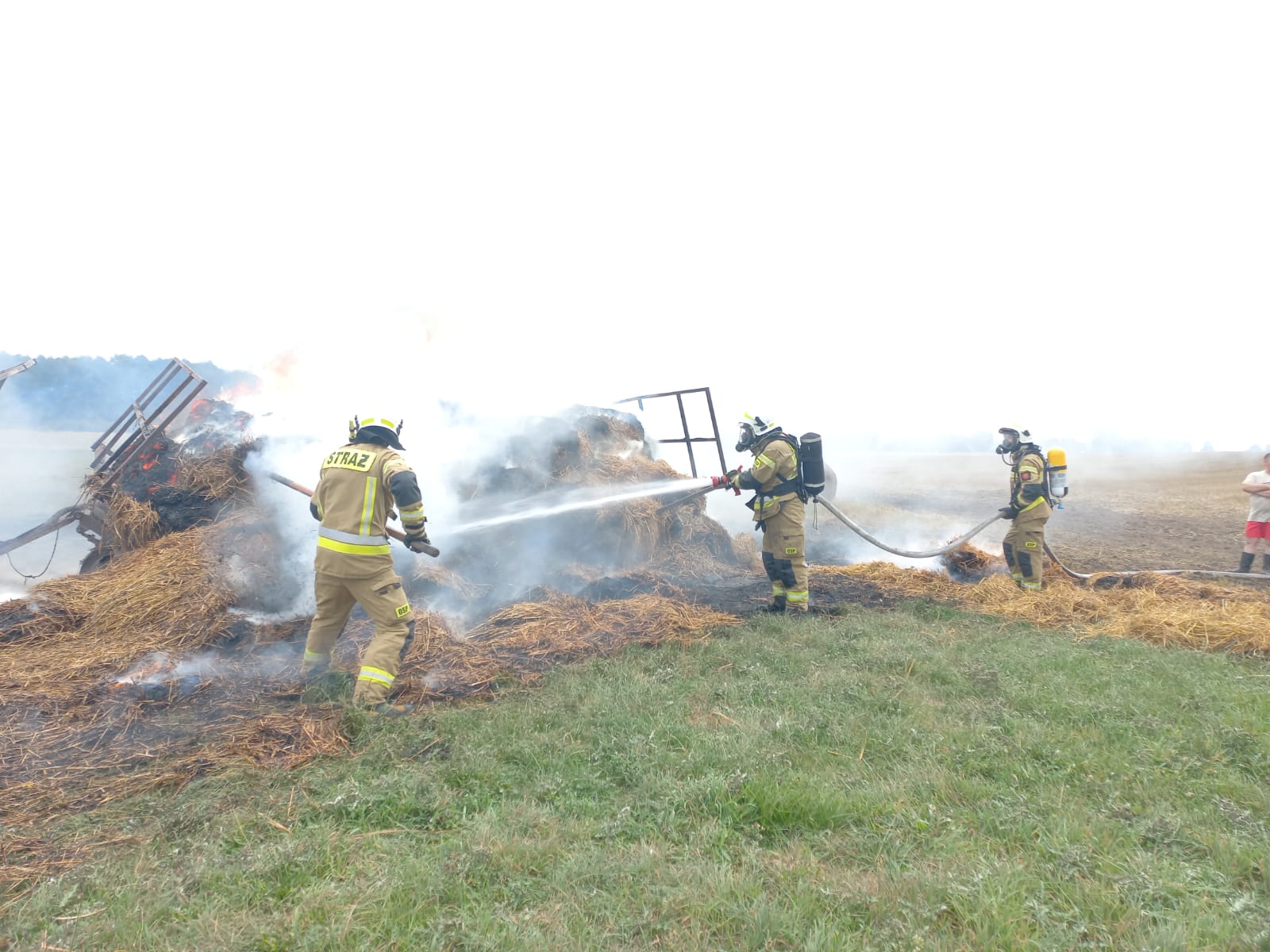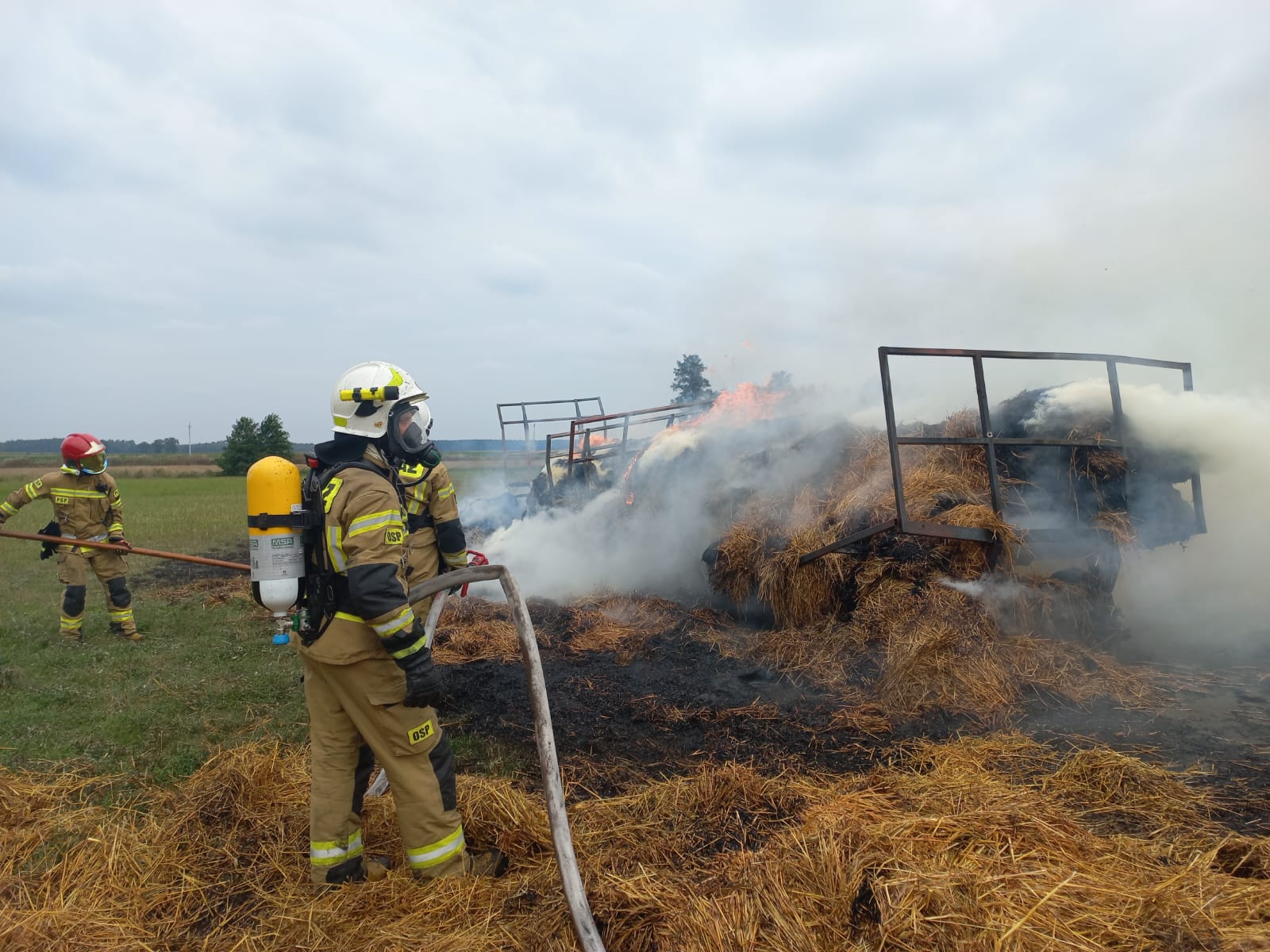 Strażacy po zabezpieczeniu miejsca zdarzenia podali dwa podali natychmiast prądy w natarciu na palące się przyczepy oraz prowadzili działania w obronie na przyległy stóg.