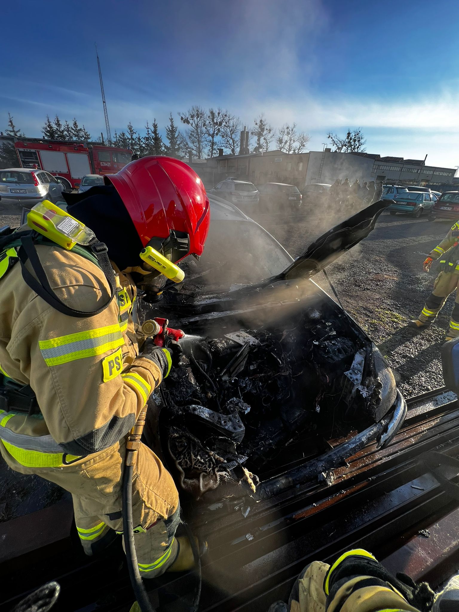 Działania straży pożarnej polegały na zabezpieczeniu miejsca zdarzenia, podaniu dwóch prądów wody w natarciu na palący się samochód osobowy.