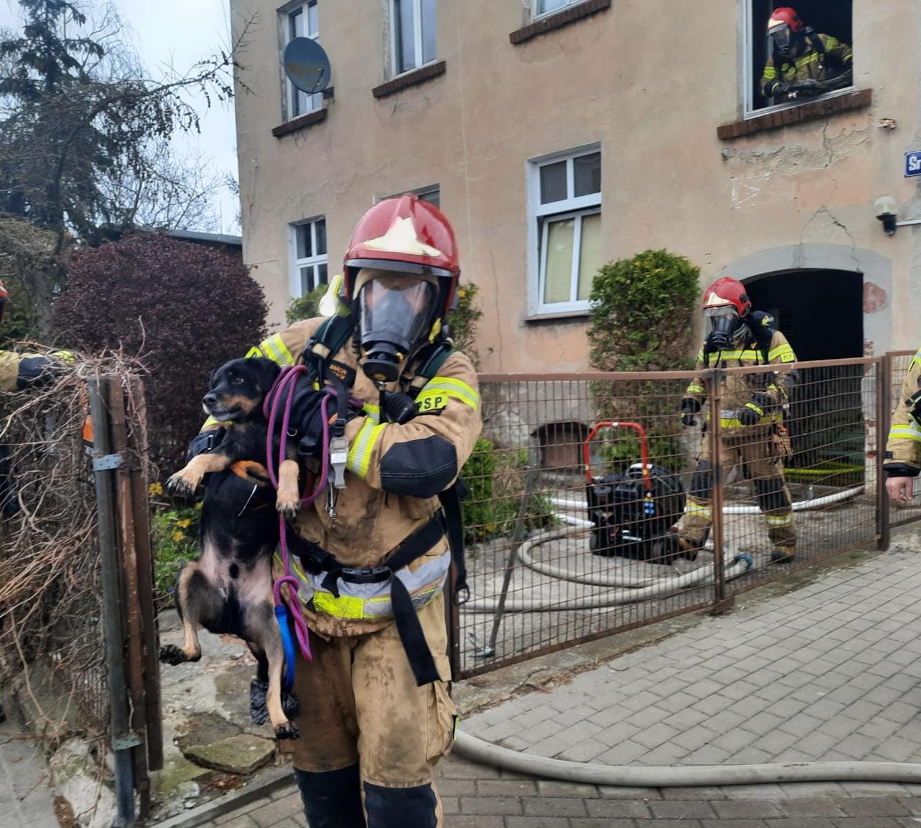 W trakcie przeszukania pomieszczeń budynku nie stwierdzono osób przebywających w mieszkaniach, jedynie natrafiono na wystraszonego pieska, który był przyjazny dla strażaków i został ewakuowany na zewnątrz.