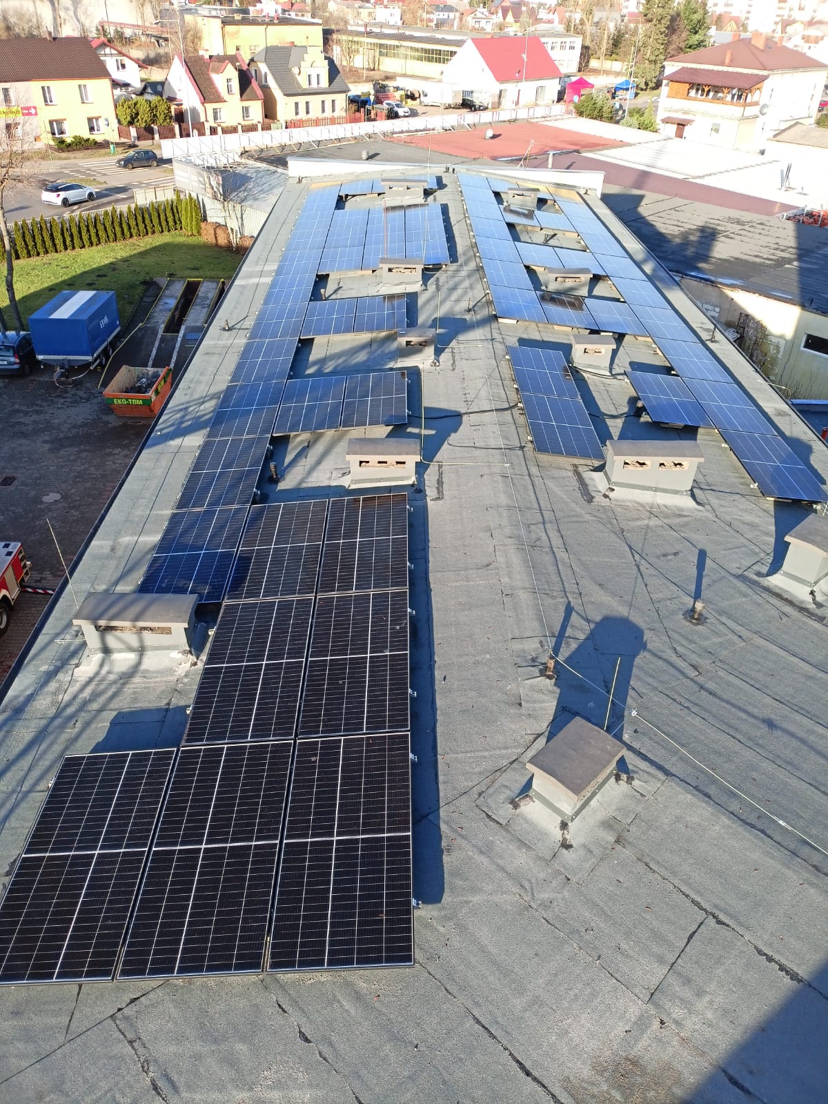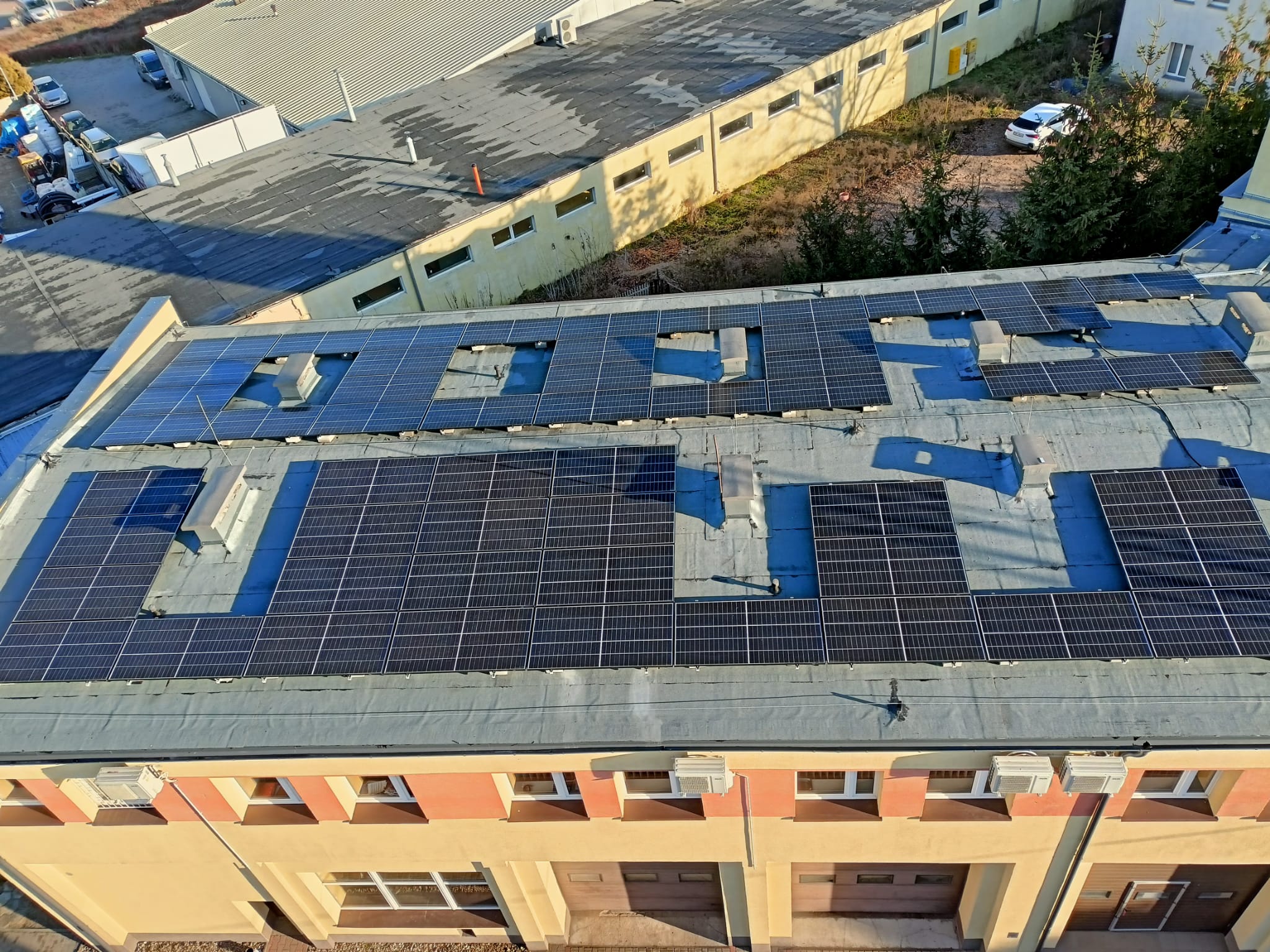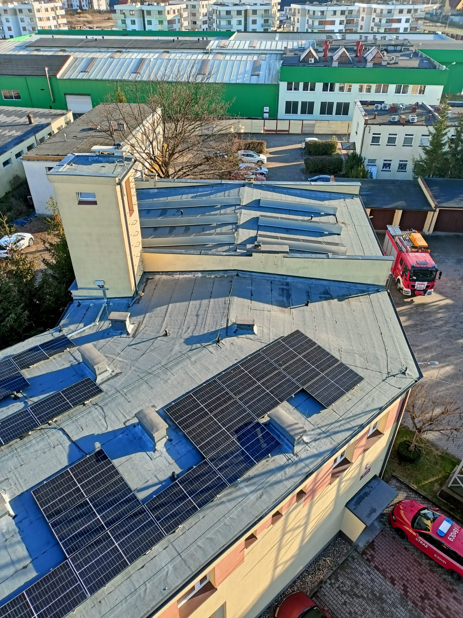Ogólny zakres rzeczowy zadania obejmował opracowanie dokumentacji projektowo – kosztorysowej, wymianę pokrycia dachowego i instalacji odgromowej na budynku KP PSP i JRG w Wągrowcu. Co ważne w ramach tego zadania Komenda Powiatowa PSP w Wągrowcu dokonała montażu instalacji fotowoltaicznej, która została umiejscowiona na budynku komendy. Łącznie zamontowano 77 paneli fotowoltaicznych, które wpłyną na zmniejszenia kosztów energii elektrycznej oraz wpłyną na porawę jakości środowiska. I etap przedsięwzięcia zakładał również wymianę pokrycia papowego na obu budynkach komendy.
