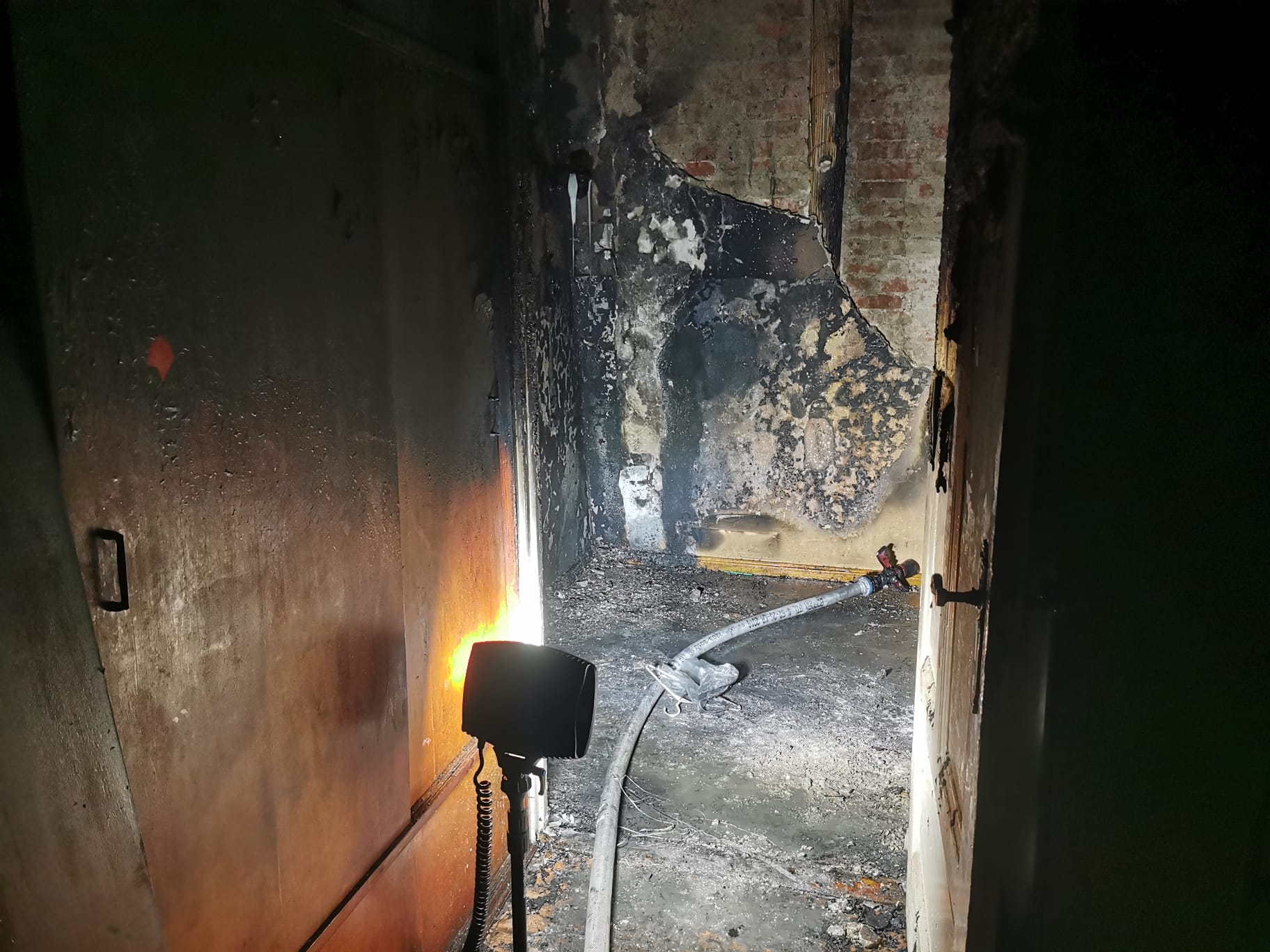 Druga rota, która weszła do budynku ugasiła pożar poprzez podanie jednego prądu wody w natarciu na palący się materiał palny.