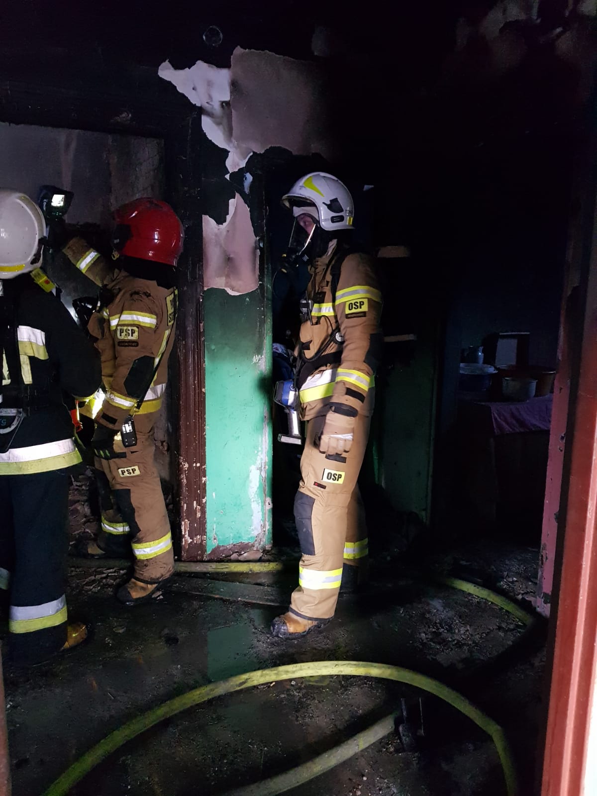 Natychmiastowe działania straży pożarnej polegały na zabezpieczeniu miejsca zdarzenia, oraz podaniu dwóch prądów wody w natarciu na palące się mieszkanie. W trakcie przeszukiwania mieszkania objętego pożarem strażacy natrafili na zwęglone zwłoki człowieka, które znajdowały się na pozostałościach po spalonym tapczanie w niedalekiej odległości od pieca kaflowego. W tym samym czasie strażacy na zewnątrz udzielali kwalifikowanej pierwszej pomocy osobom, które same opuściły budynek objęty pożarem, dwie z tych osób decyzją kierownika Zespołu Ratownictwa Medycznego zostały przewiezione do szpitala z podejrzeniem podtrucia gazami pożarowymi.