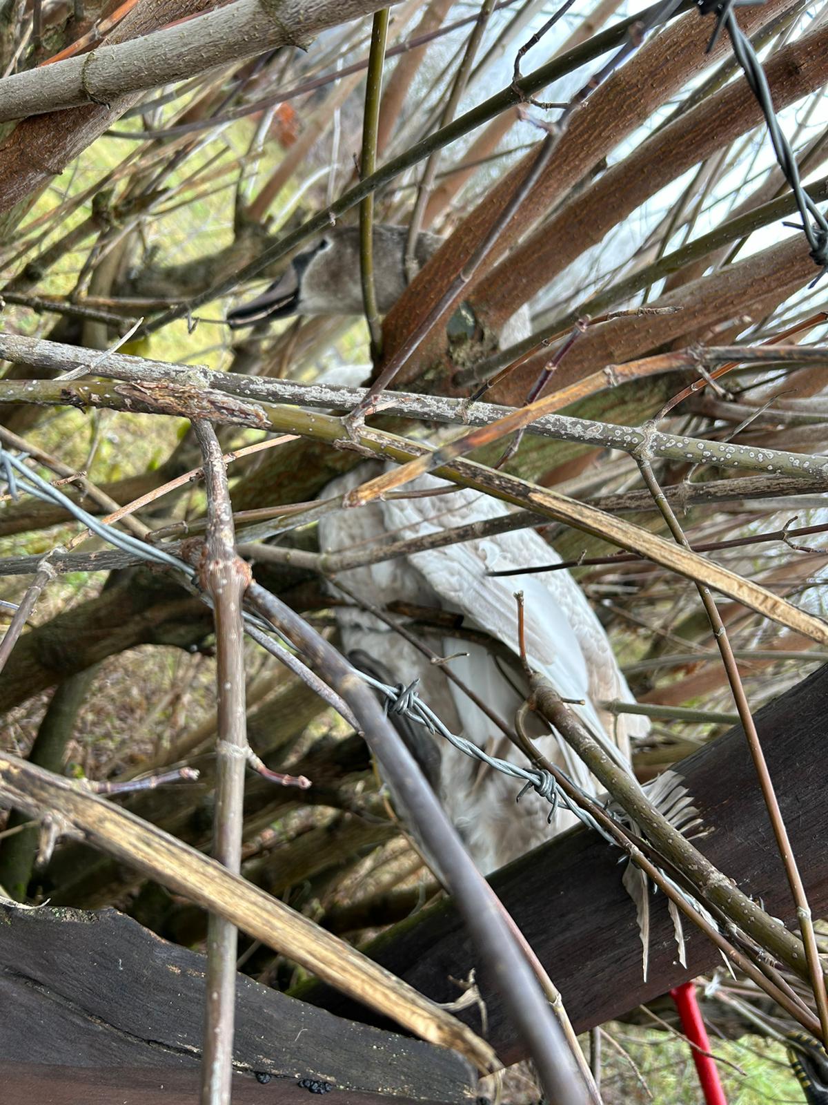 Po przyjeździe straży pożarnej na miejsce zdarzenia okazało się, że jeden łabędź jest uwieziony w gałęziach drzewa, a drugi z ptaków został uwięziony pomiędzy siatką ogrodzeniową a budynkiem gospodarczym.