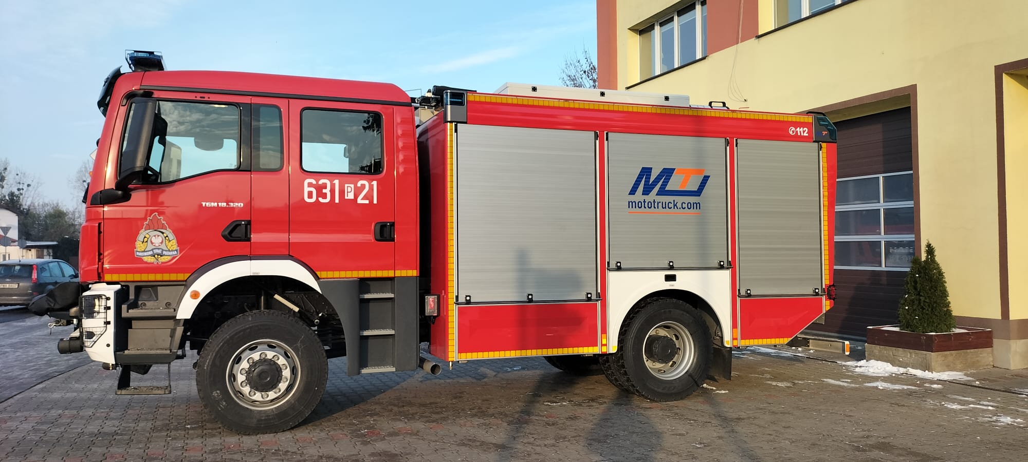 Zabudowa pożarnicza nowego samochodu wykonana została przez firma MOTO-TRUCK Sp. z o.o z siedzibą w Kielcach w wykonana jest na podwoziu marki MAN TGM 18.320 z napędem 4x4 (uterenowiony) oraz silnik o pojemności 6871 cm3 i mocy 275 kW.