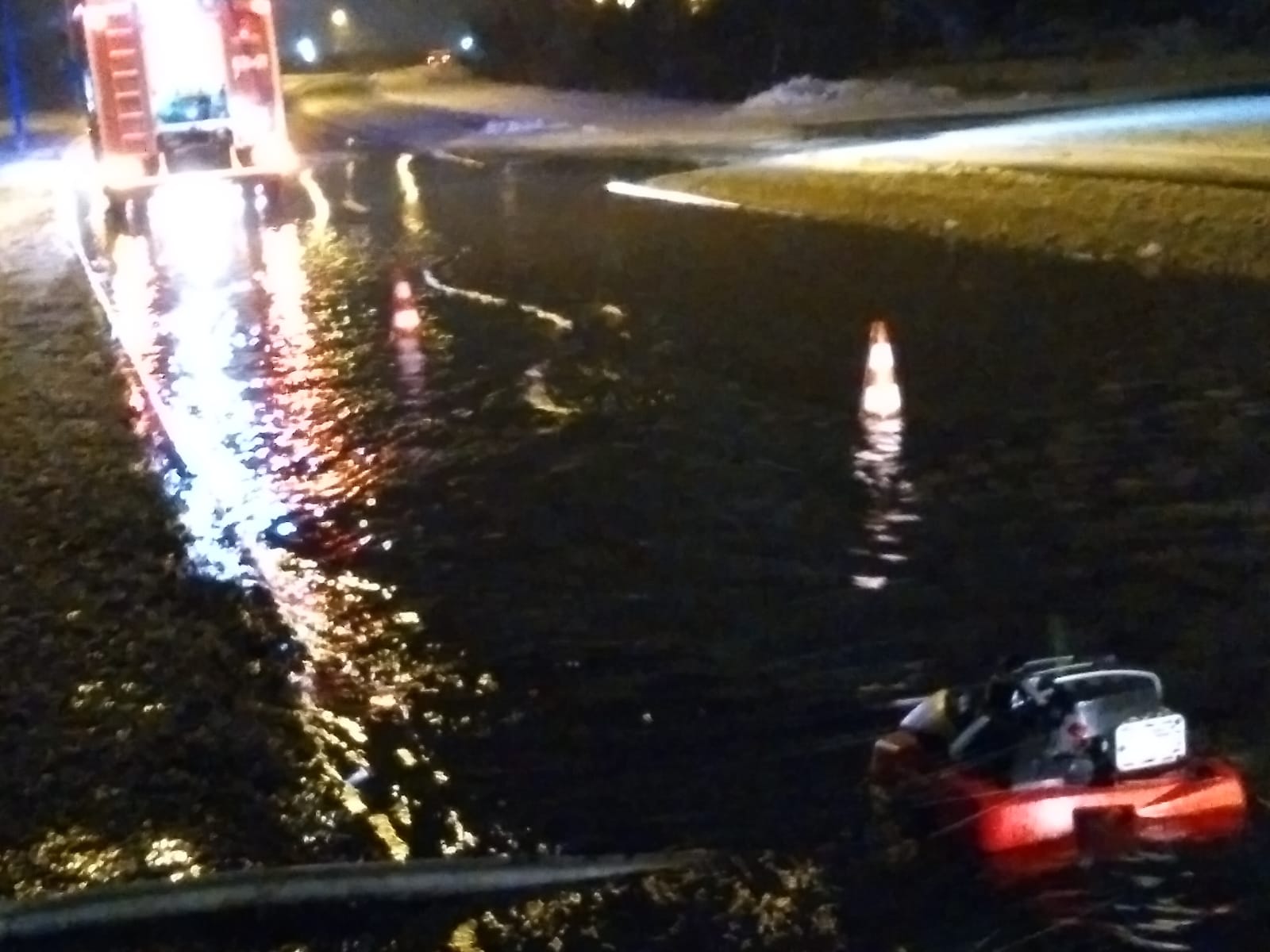 Po przybyciu na miejsce zdarzenia okazało się, że w wyniku intensywnych opadów deszczu ze śniegiem oraz w skutek niedrożności studzienek deszczowych, droga jest zalana na całej szerokości na odcinku około 80 metrów.