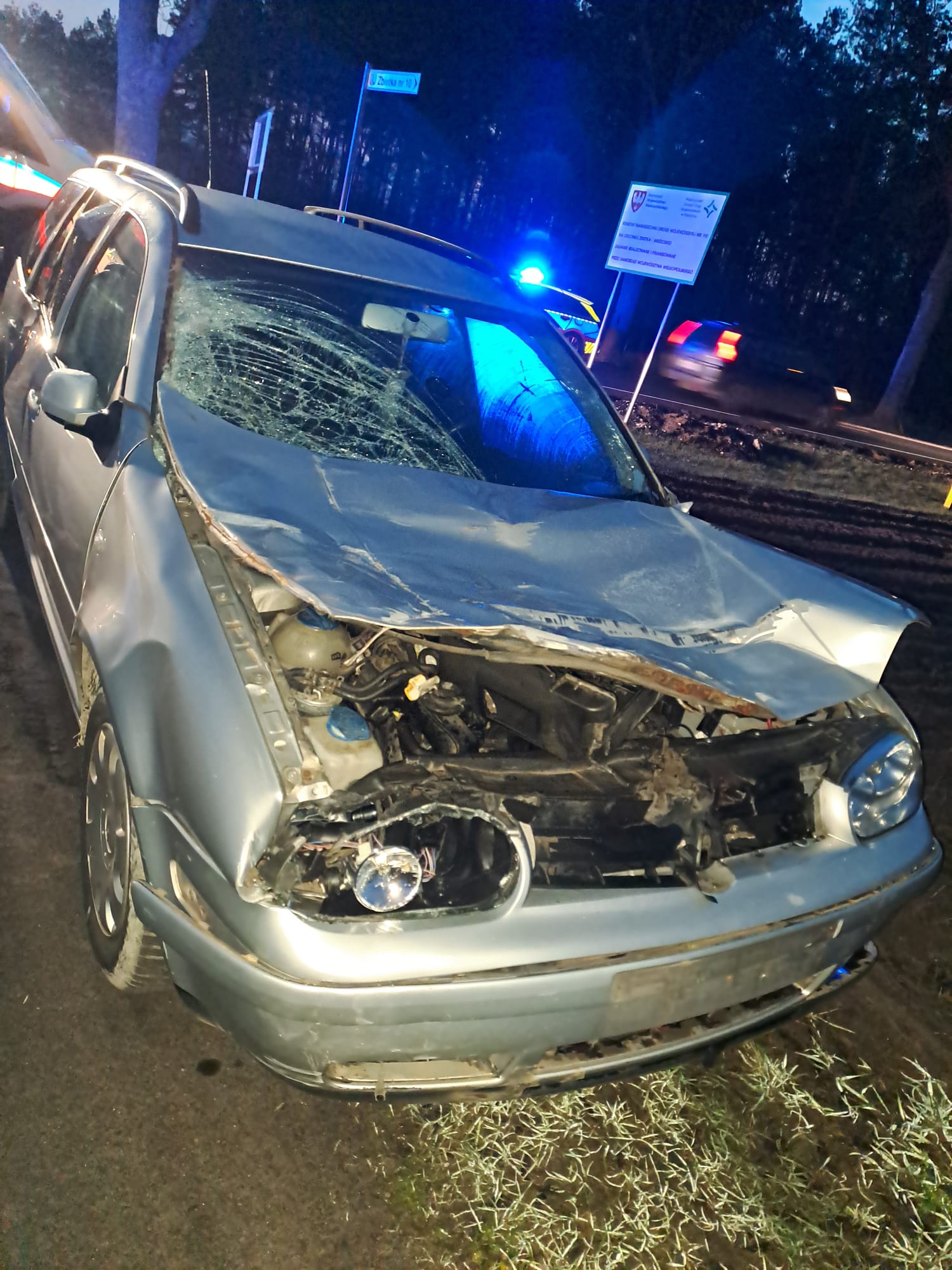 Po przyjeździe na miejsce zdarzenia zastępu straży pożarnej potwierdzono, że doszło do zderzenia samochodu z jeleniem. Kierujący, bez obrażeń, przebywał poza pojazdem wyjaśniając Policji okoliczności zdarzenia. W wyniku obrażeń zwierzę poniosło śmierć na miejscu.