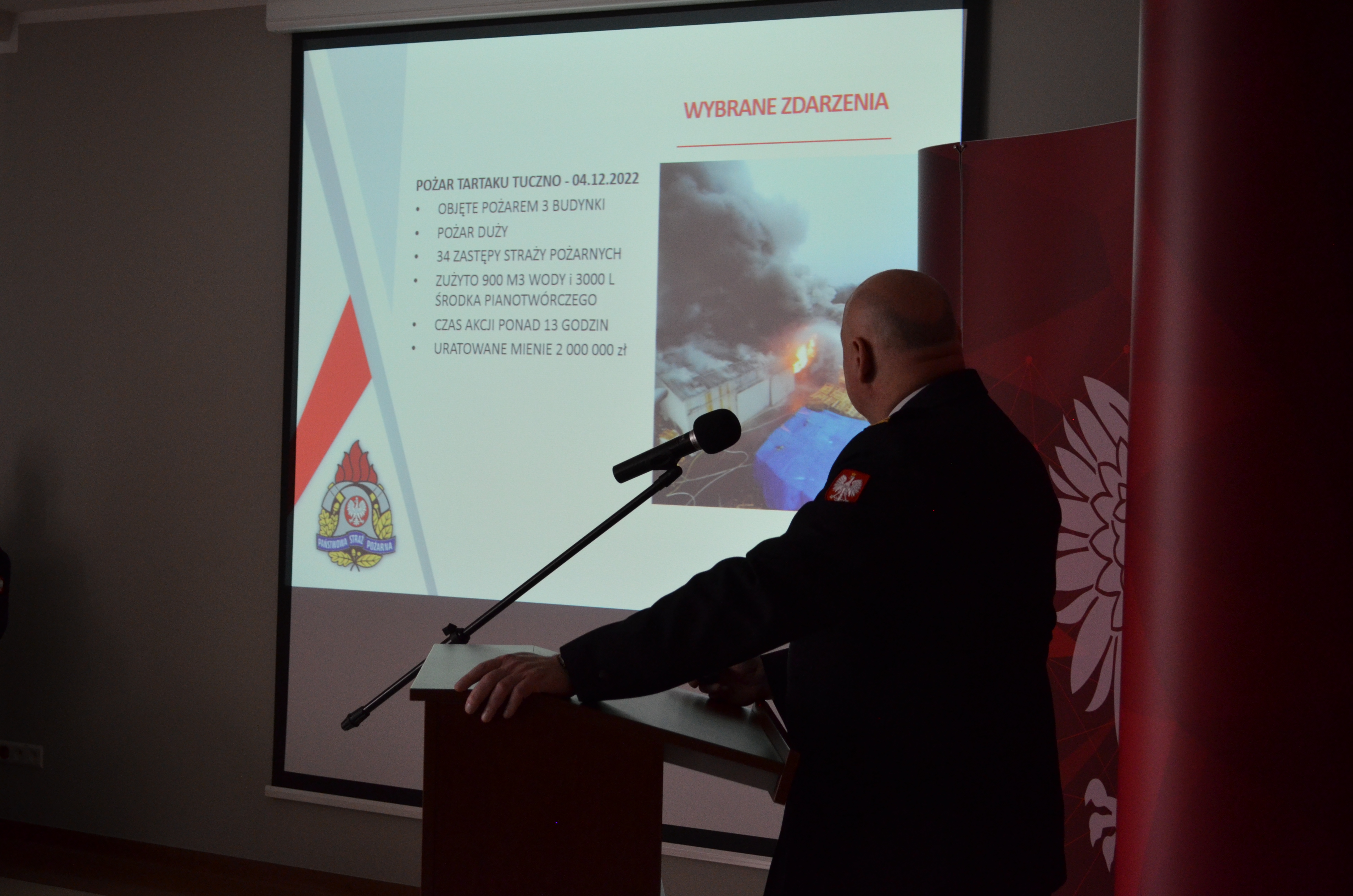 W drugiej części uroczystości Komendant Powiatowy PSP w Wałczu st. bryg. Dariusz Lubianiec przedstawił prezentację z działalności Komendy Powiatowej PSP w Wałczu w roku 2022, w tym omówił proces finansowania i zakupu trzech nowych pojazdów, których łączna wartość to 1 812 440,00 zł.: