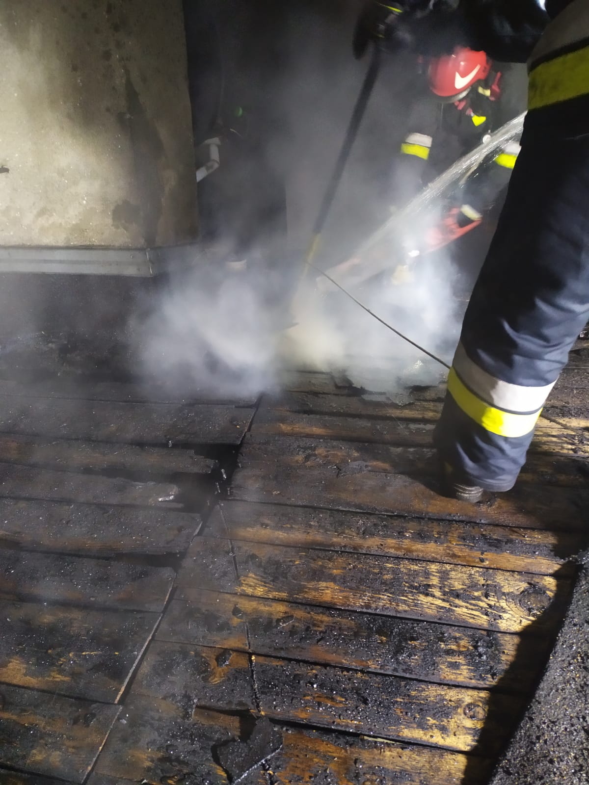 Po przybyciu na miejsce zdarzenia strażacy stwierdzili że pożarem objęta była część stropodachu, a działania dodatkowo utrudniało silne zadymienie i pora nocna.