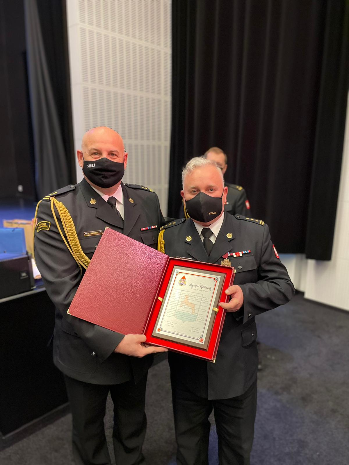Z okazji zakończenia służby Komendant Powiatowy PSP w Wałczu bryg. Dariusz Lubianiec przekazał na ręce st. bryg. Rafała Mrowińskiego okolicznościowy grawerton z życzeniami od wszystkich funkcjonariuszy i pracowników cywilnych Komendy Powiatowej PSP w Wałczu.