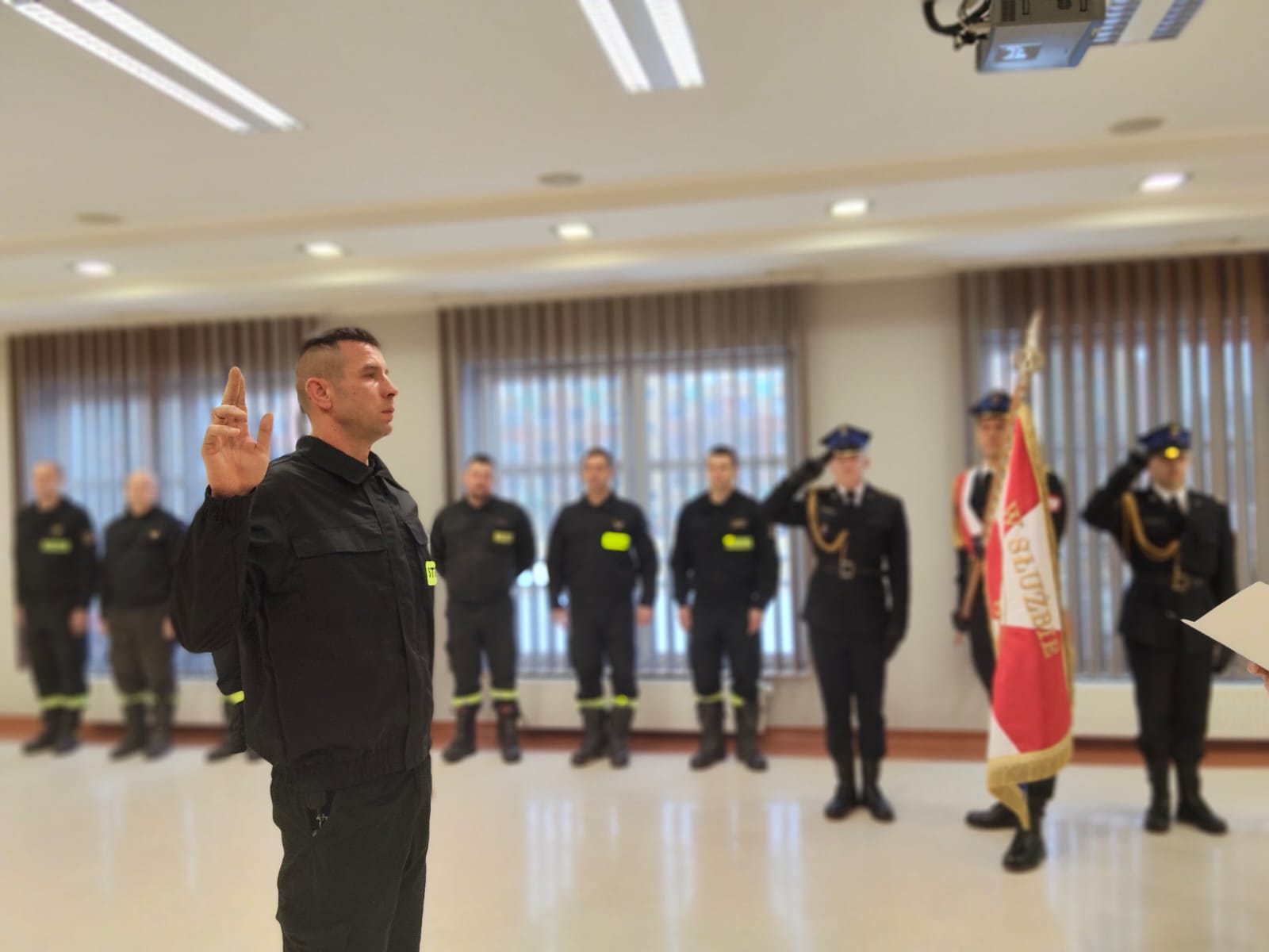 Rozpoczynający służbę w Państwowej Straży Pożarnej, strażak składa ślubowanie, którego słowa brzmią: