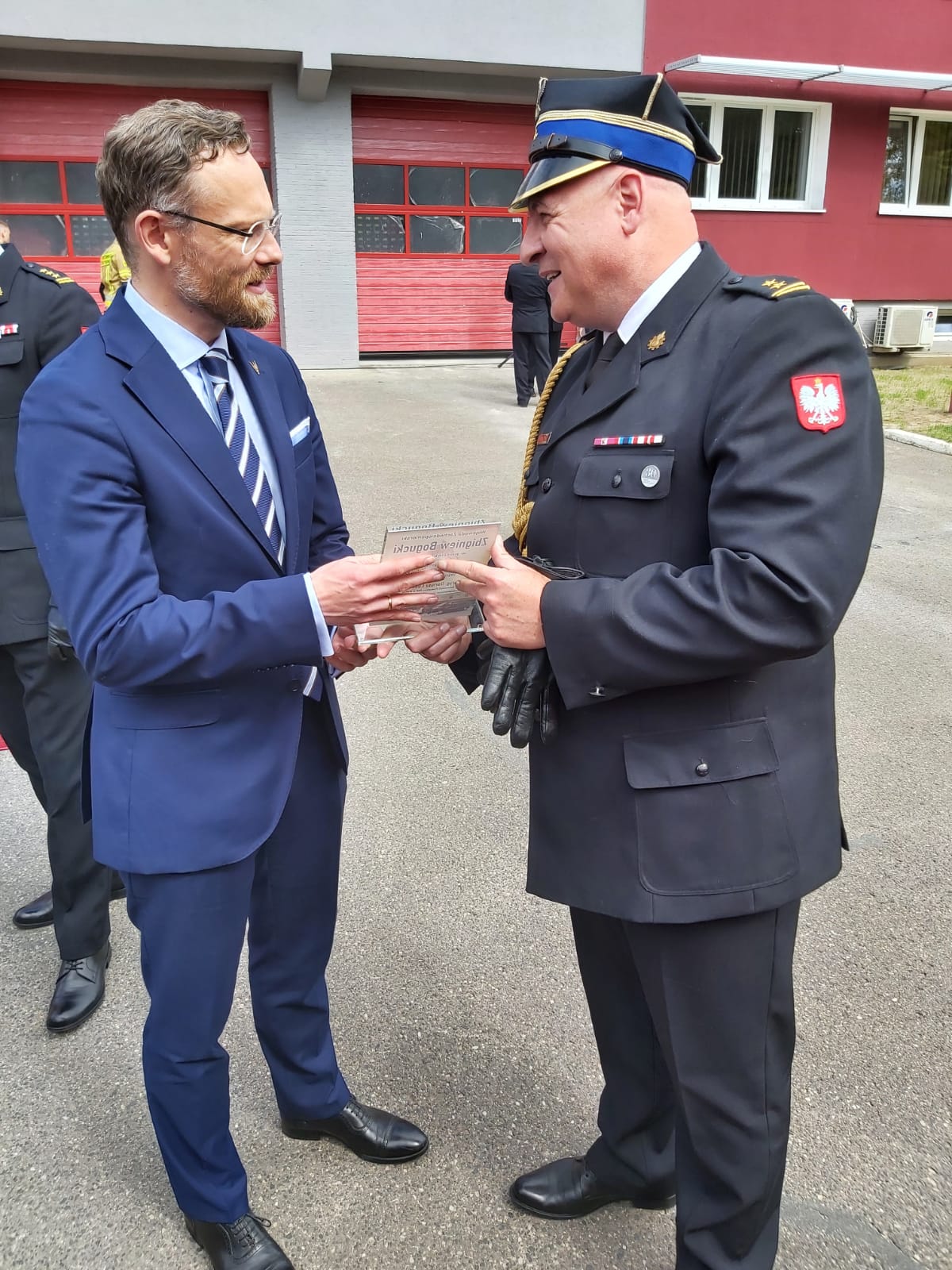 bryg. Dariusz Lubianiec korzystając z obecności na uroczystości Wojewody Zachodniopomorskiego Pana Zbigniewa Boguckiego przekazał na jego ręce okolicznościowy grawerton od funkcjonariuszy i pracowników cywilnych Komendy Powiatowej PSP w Wałczu w podziękowaniu za zaangażowanie i pomoc w pozyskaniu samochodów oraz wspieranie bieżącej działalności komendy.