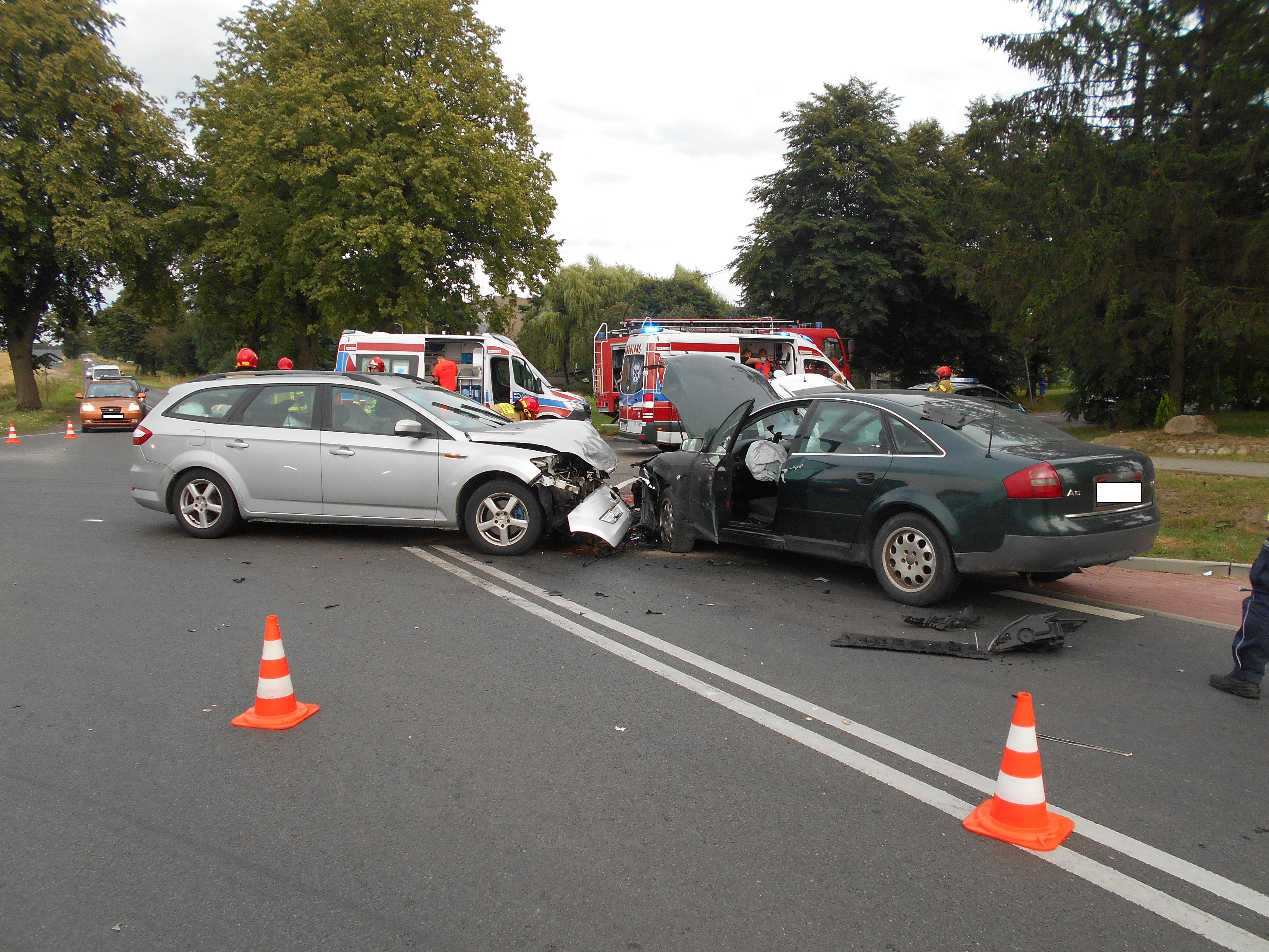 Na miejsce zadysponowano dwa zastępy z KP PSP Wałcz oraz zastęp z Wojskowej Straży Pożarnej. Po dojeździe zastępów PSP na miejsce zdarzenia stwierdzono, że dwa samochody stoją na środku skrzyżowania z wyraźnymi uszkodzeniami karoserii, natomiast trzecie auto znajdowało się w przydrożnym rowie. Kierowcy wraz z pasażerami opuścili pojazdy o własnych siłach. Łącznie w autach osobowych podróżowało 5 osób z czego dwie zostały przetransportowane przez ZRM do szpitala.