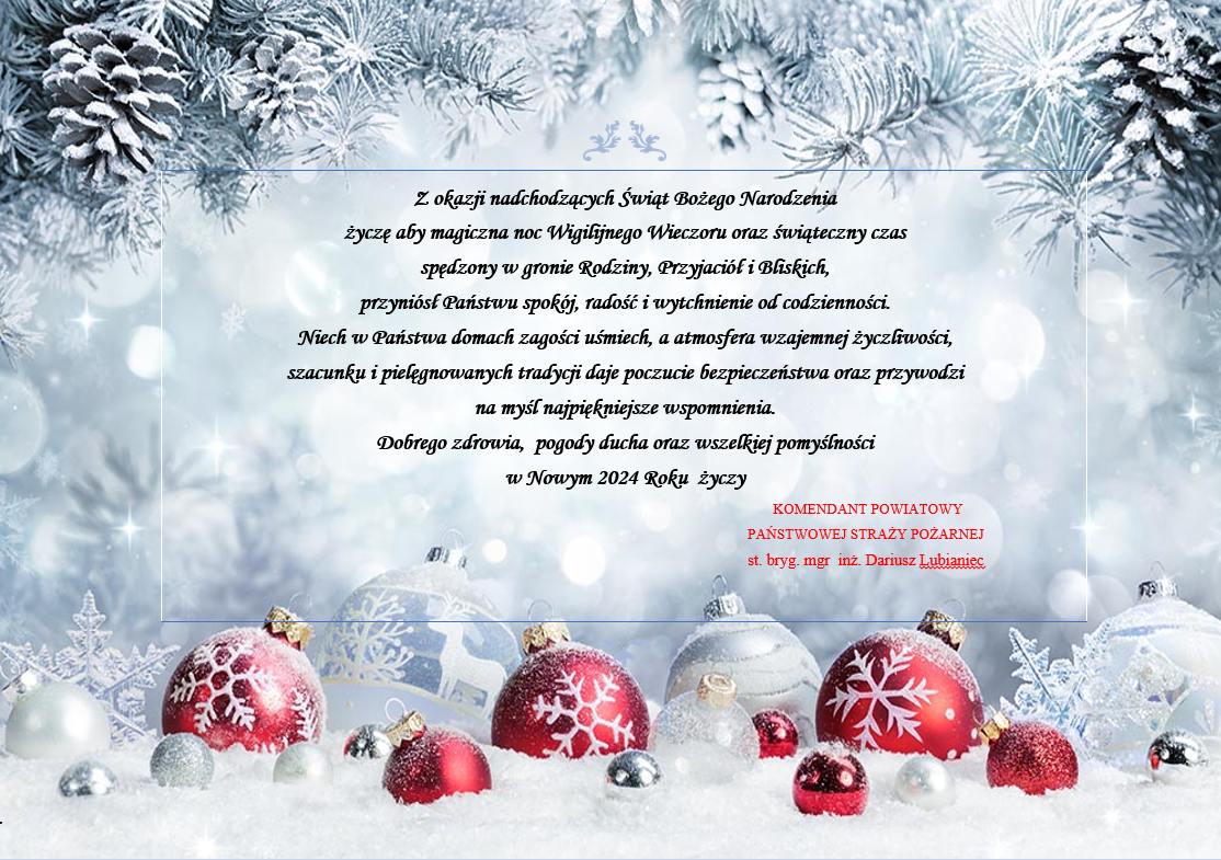 Z okazji nadchodzących Świąt Bożego Narodzenia życzę aby magiczna noc Wigilijnego Wieczoru oraz świąteczny czas spędzony w gronie Rodziny, Przyjaciół i Bliskich, przyniósł Państwu spokój, radość i wytchnienie od codzienności. Niech w Państwa domach zagości uśmiech, a atmosfera wzajemnej życzliwości, szacunku i pielęgnowanych tradycji daje poczucie bezpieczeństwa oraz przywodzi na myśl najpiękniejsze wspomnienia. Dobrego zdrowia, pogody ducha oraz wszelkiej pomyślności w Nowym 2024 Roku życzy