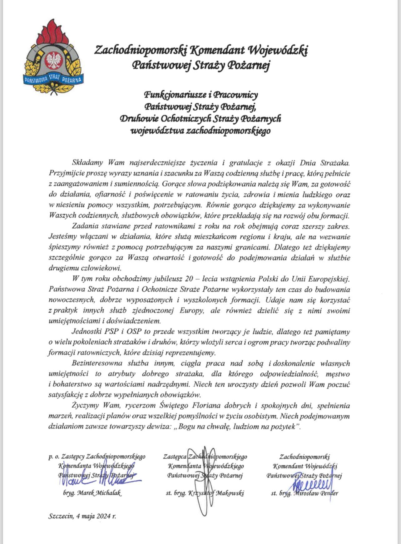 Życzenia Zachodniopomorskiego Komendanta Wojewódzkiego PSP z okazji Dnia Strażaka