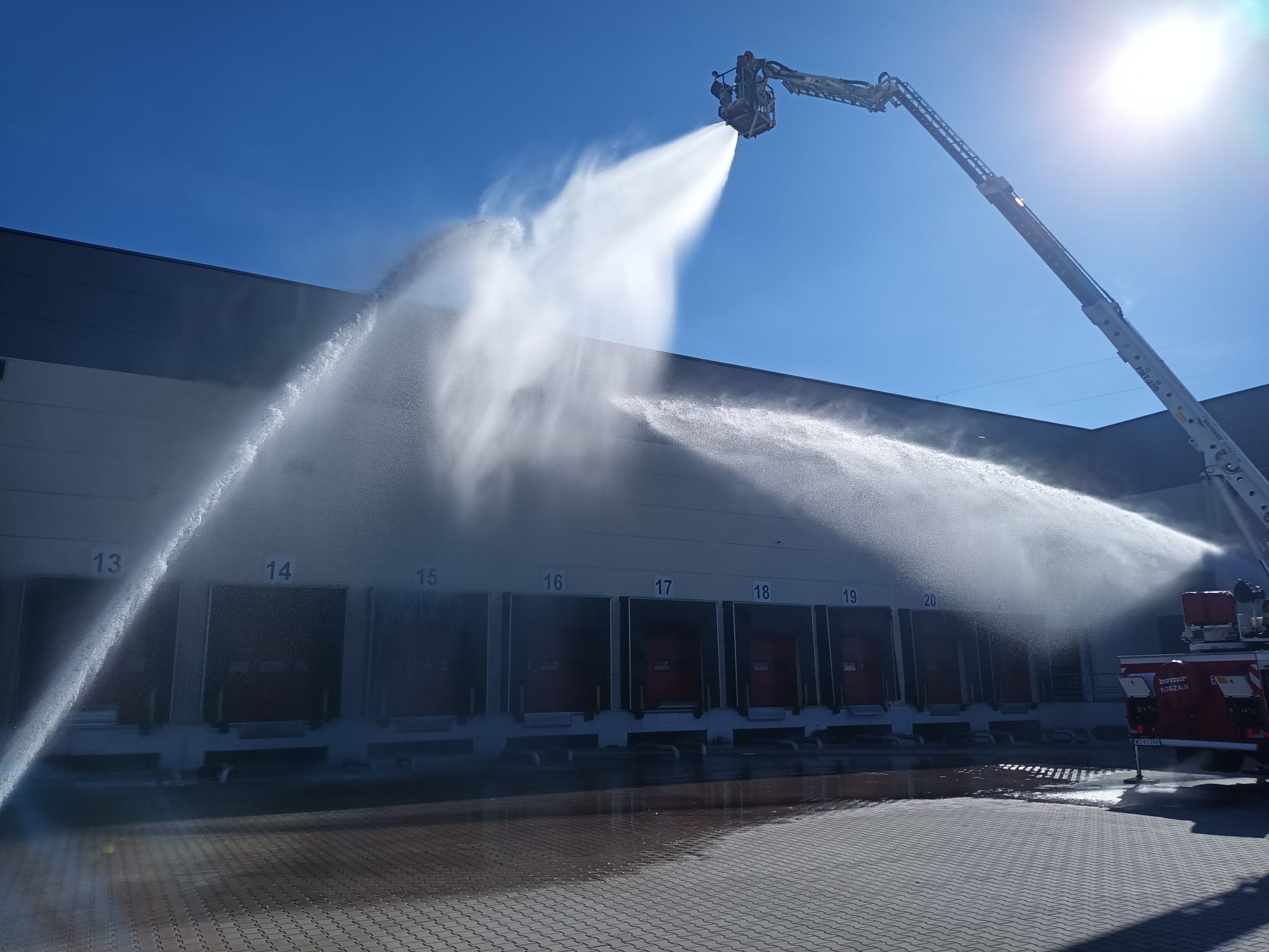 Szczególnym wyzwaniem było zapewnienie odpowiedniej ilości wody na miejscu akcji, dlatego zbudowane zostały bufory w postaci zbiorników przenośnych. Wykorzystaliśmy również zbiornik przeciwpożarowy znajdujący się na terenie rynku.
