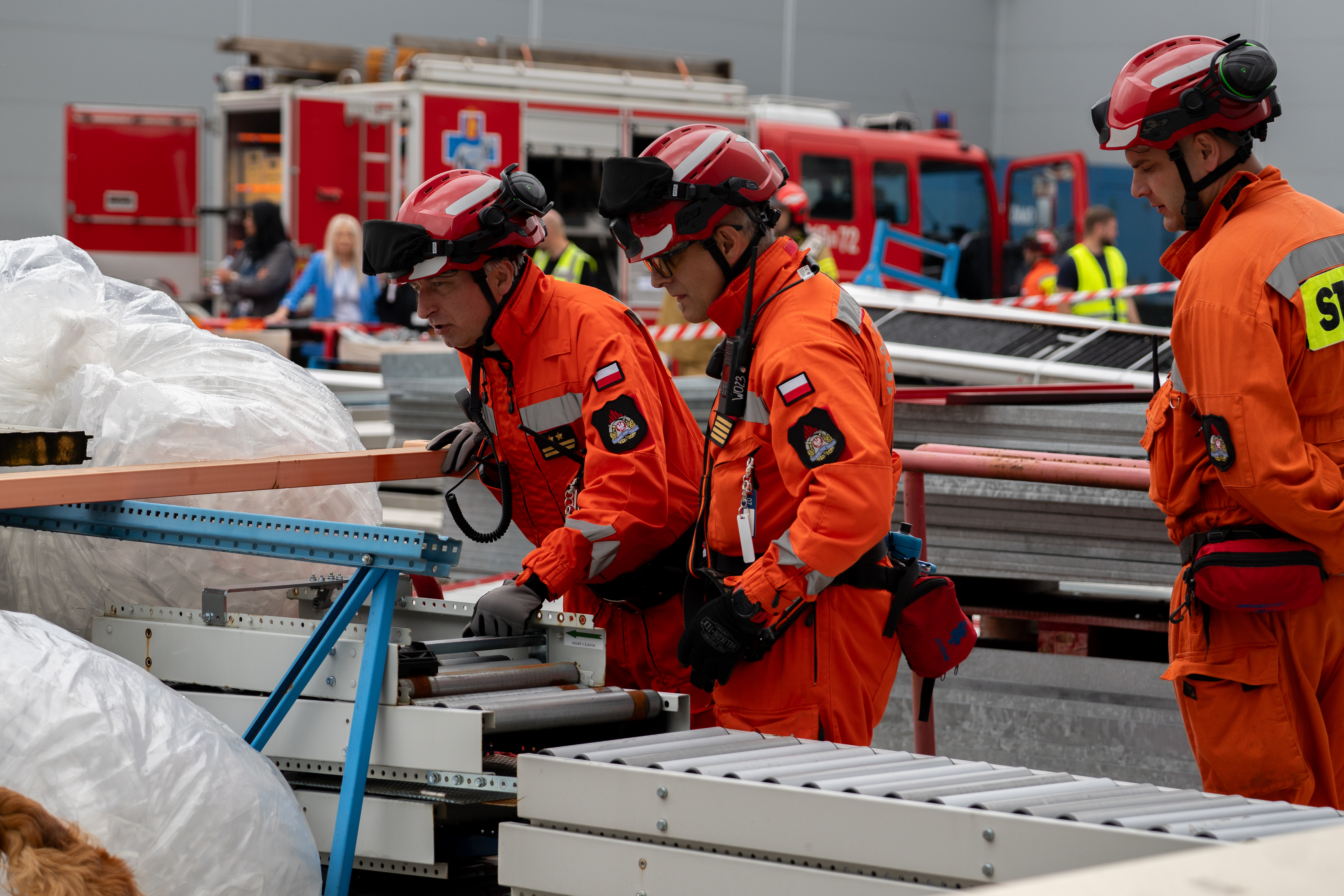 Scenariusz ćwiczeń zakładał wypadek na hali magazynowej, gdzie doszło do przewrócenia się regałów i wózka widłowego. W zadymionym obiekcie znajdowały się dwie osoby poszkodowane – operator przygnieciony przez sprzęt oraz współpracownik z widocznymi obrażeniami. Dodatkowo na placu zewnętrznym zasymulowano zawalenie się konstrukcji, pod którą uwięzieni zostali pozoranci. Ich lokalizacji dokonały psy ratownicze, a dostęp zapewnili ratownicy SGPR. Poszkodowani trafili pod opiekę Zespołów Ratownictwa Medycznego.