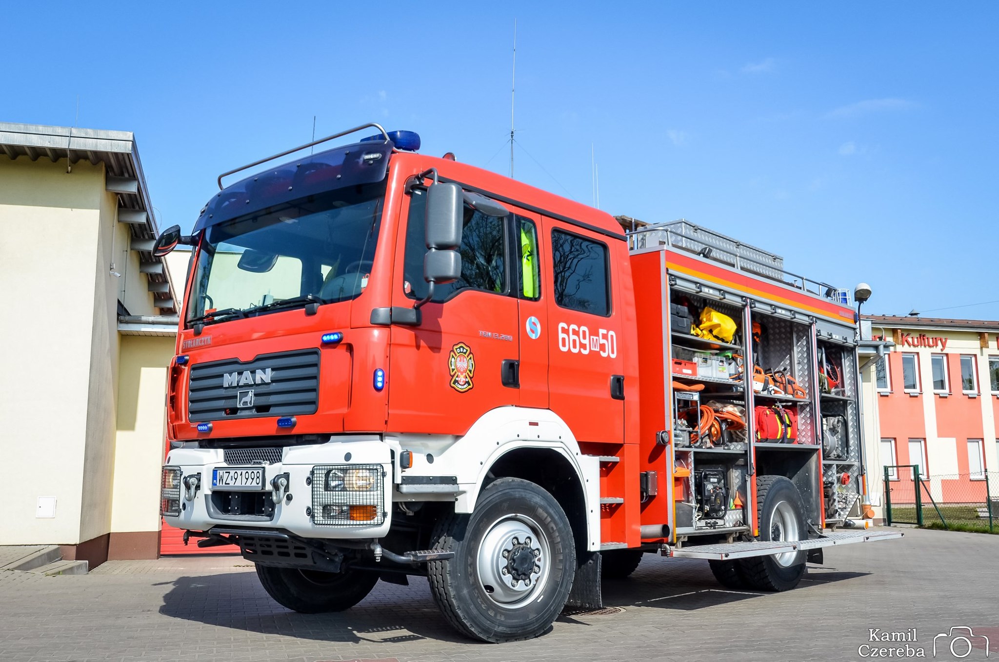 Średni samochód ratowniczo - gaśniczy na uterenowionym podwoziu MAN TGM 13.280. wykorzystywany jest w pierwszej kolejności do usuwania skutków anomalii pogodowych oraz gaszenia pożarów nieużytków i kompleksów leśnych.