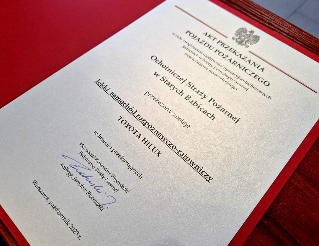 Do Komendy Powiatowej PSP w Pruszkowie trafił nowy średni samochód ratowniczo–gaśniczy na podwoziu Renault D16. Komenda Powiatowa PSP w Powiecie Warszawskim Zachodnim otrzymała nowy lekki samochód rozpoznawczo–ratowniczy na podwoziu Toyoty Hilux. Natomiast na rzecz Ochotniczej Straży Pożarnej w Starych Babicach przekazano lekki samochód rozpoznawczo-ratowniczy na podwoziu Toyoty Hilux eksploatowany dotychczas w KP PSP w Powiecie Warszawskim Zachodnim.