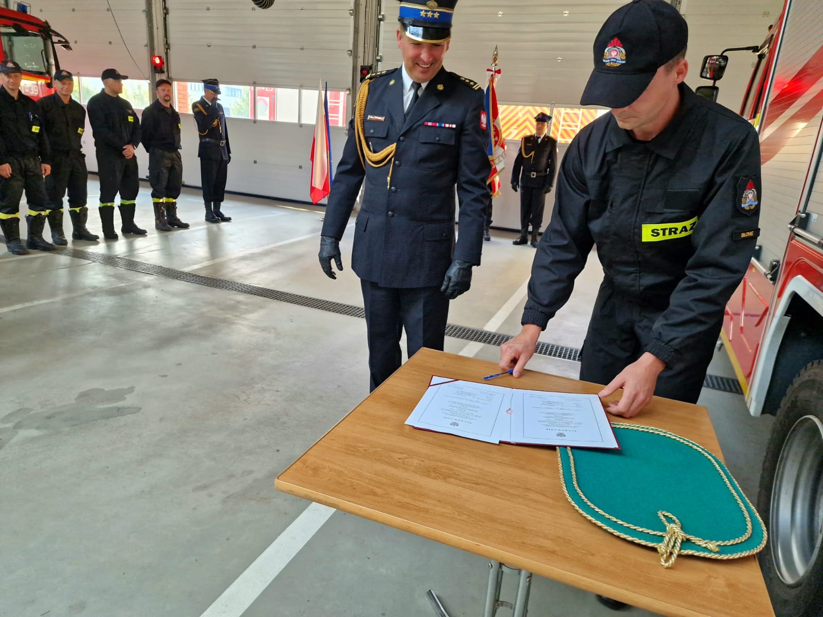 Następnie strażak złożył podpis pod aktem ślubowania, pieczętując ten ważny moment w karierze zawodowej.