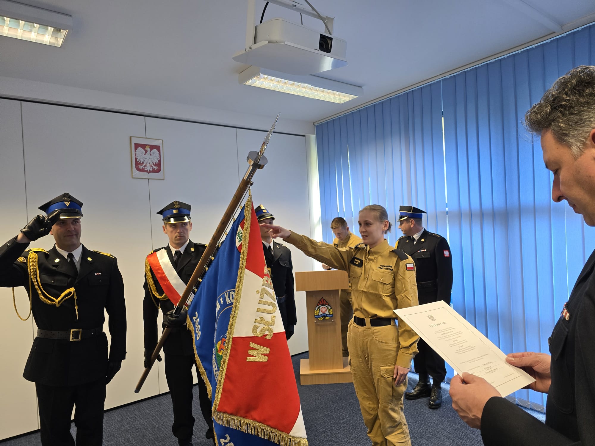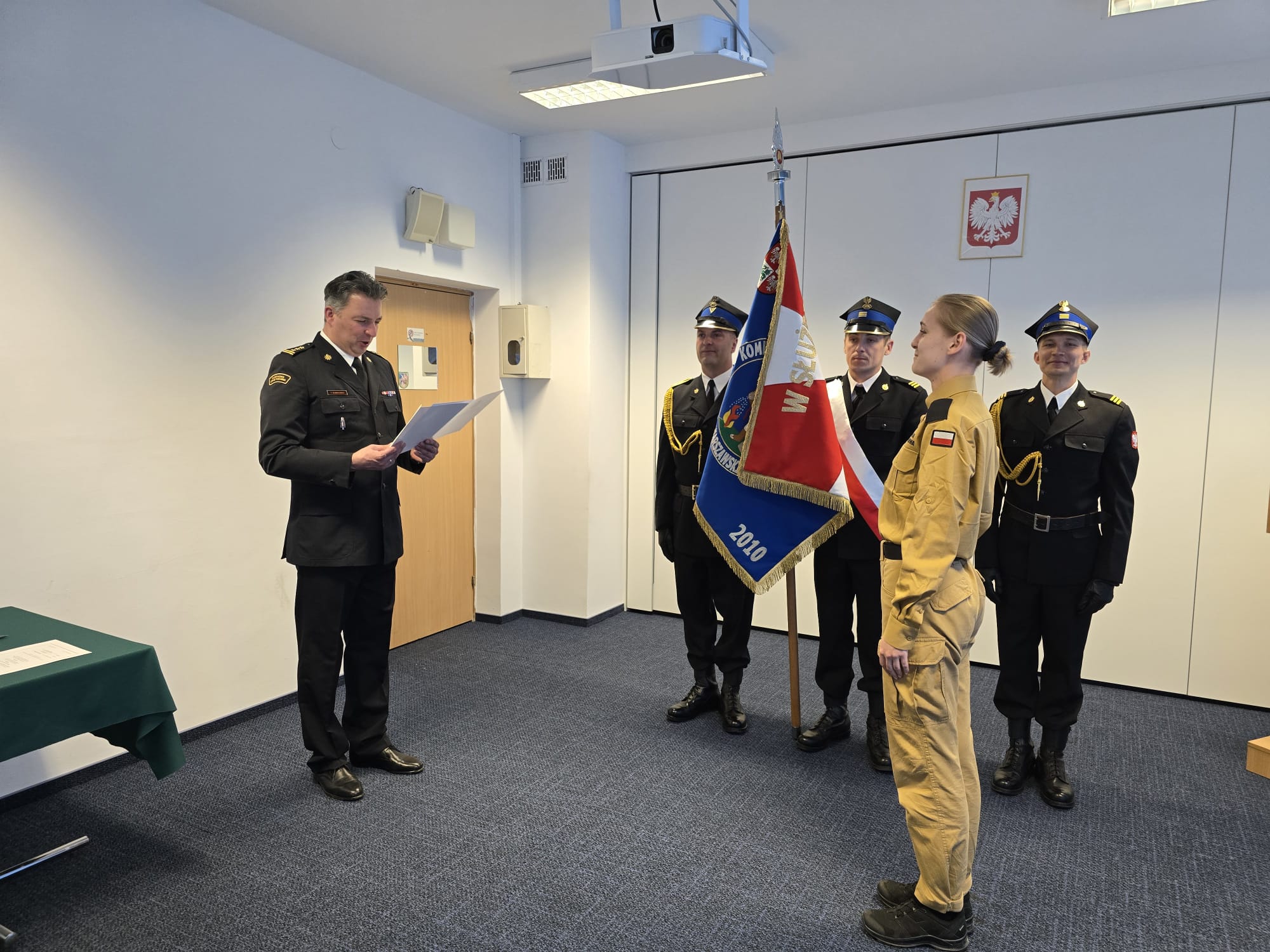 W uroczystości udział wziął Komendant Powiatowy PSP st. bryg. Robert Nowakowski i kadra PSP i JRG. Komendant podkreślił wagę tej chwili oraz znaczenie etosu strażackiej służby, życząc nowemu pracownikowi dużo zadowolenia z pełnienia obowiązków służbowych oraz spełniania się w nowej roli.