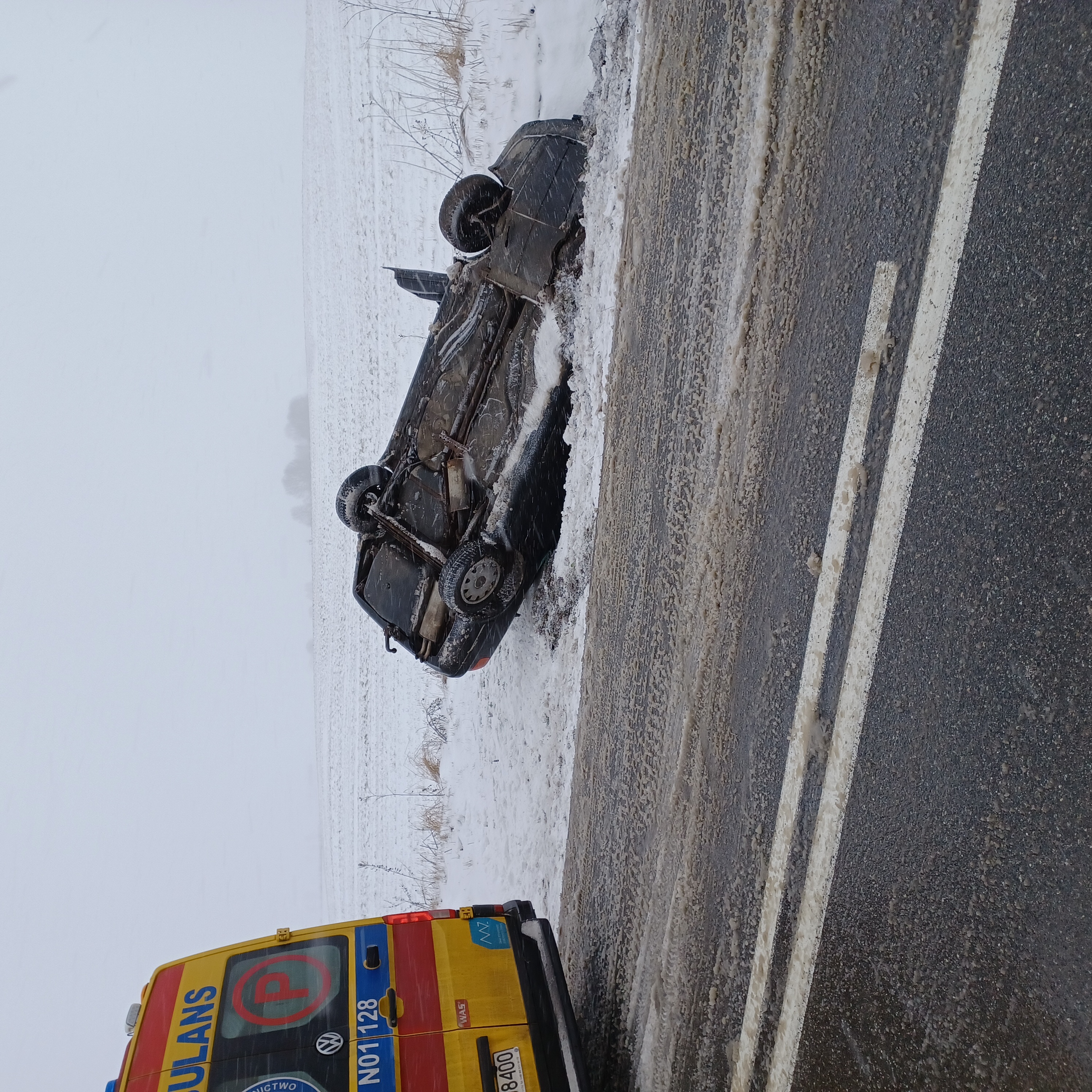 Po dojechaniu pierwszych zastępów na miejsce okazało się, że samochód osobowy zjechał z drogi a następnie dachował. Autem podróżowała osoba dorosła i dziecko. Działania zastępów polegały na zabezpieczeniu miejsca zdarzenia, odłączeniu akumulatora oraz pomocy policji w kierowaniu ruchem.