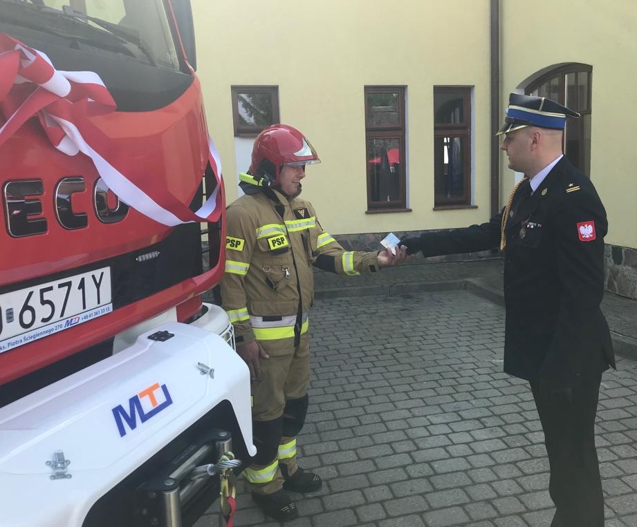 Istotnym elementem uroczystości było przekazani i poświęcenie samochodu ratowniczo-gaśniczego Iveco Eurocargo GBA-Rt. Wartość samochodu to niespełna 1 200 000 zł. Pojazd jest w pełni wyposażony w sprzęt ratowniczy niezbędny do prowadzenia działań ratowniczo-gaśniczych. Zakup realizowany był dzięki środkom z Budżetu Państwa oraz w ramach projektu „Usprawnienie systemu ratownictwa na drogach - etap IV” współfinansowanego przez Unię Europejską ze środków Funduszu Spójności w ramach Programu Infrastruktura i Środowisko, jednostek samorządowych powiatu węgorzewskiego oraz instytucji zaprzyjaźnionych. Nowy samochód pożarniczy pobłogosławił i poświęcił ks. prał. Klemens Litwin kapelan węgorzewskich strażaków.