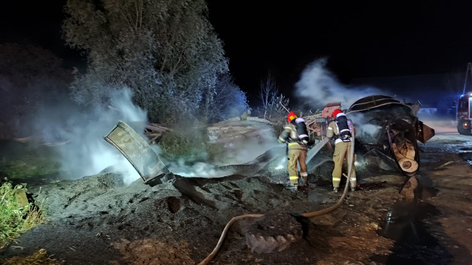 Działania zastępów polegały na zabezpieczeniu miejsca zdarzenia a następnie podanie prądów wody na palącą się suszarnie oraz magazyn.