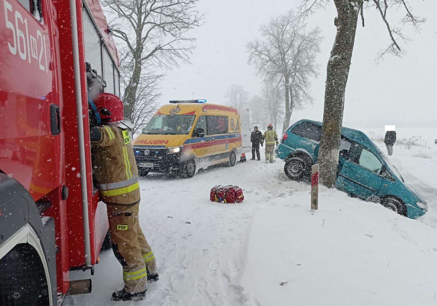 Natychmiast do zdarzenia zostały zadysponowane 2 zastępy węgorzewskich strażaków. Na miejscu okazało się, iż kierowca samochodu osobowego stracił panowanie nad pojazdem i uderzył w drzewo. Samochodem podróżowały 2 osoby, które o własnych siłach opuściły pojazd. Osoby biorące udział w zdarzeniu zostały zabrana do szpitala przez zespół ratownictwa medycznego. Działania zastępów polegały na zabezpieczeniu miejsca zdarzenia i odłączeniu akumulatora. Przybyła na miejsce Policja bada okoliczności zdarzenia. Na czas działań droga była zablokowana w obu kierunkach.