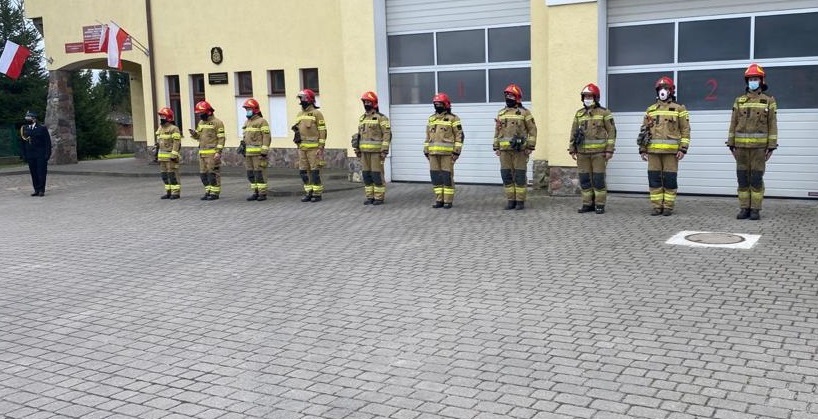 Uroczysta zmiana służby w KP PSP w Węgorzewie z okazji Dnia Flagi Rzeczypospolitej Polskiej