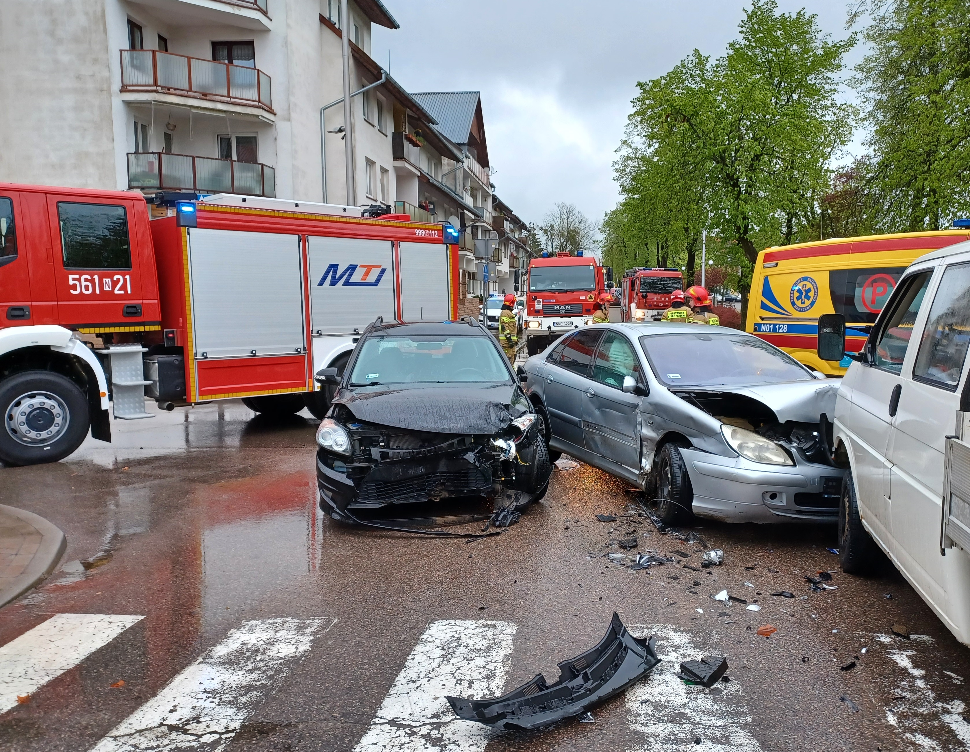 12 maja b.r. w godzinach popołudniowych do Stanowiska Kierowania Komendanta Powiatowego PSP w Węgorzewie wpłynęło zgłoszenie o zderzeniu samochodu dostawczego z dwoma samochodami osobowymi na skrzyżowaniu ul. Portowej z ul. Pionierów w Węgorzewie. Natychmiast do zdarzenia zostały zadysponowane zastępy węgorzewskich strażaków oraz zastęp wojskowej straży pożarnej. Na miejscu strażacy zastali rozbite trzy pojazdy. Przybyły na miejsce ZRM zbadał osoby biorące udział w zdarzeniu. Żadna z osób nie wymagała hospitalizacji. Okoliczności zdarzenia wyjaśnia Policja.
