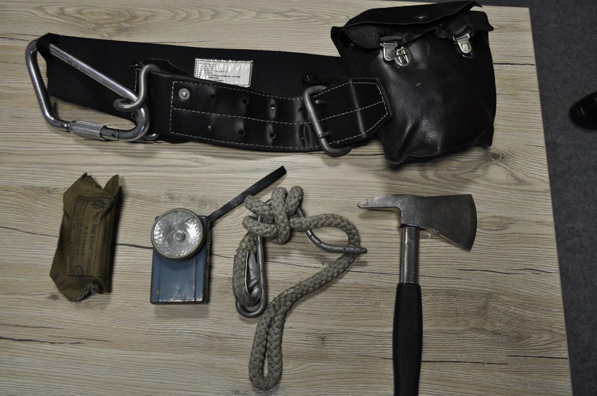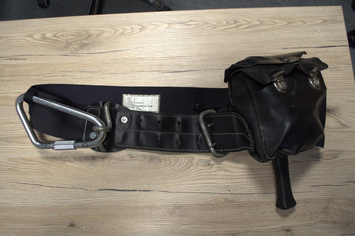 - Pas strażacki wraz z kompletnym wyposażeniem (pochewka, zatrzaśnik, podpinka, latarka, opatrunek). Cały zestaw w stanie kolekcjonerskim, posiada ślady użytkowania.