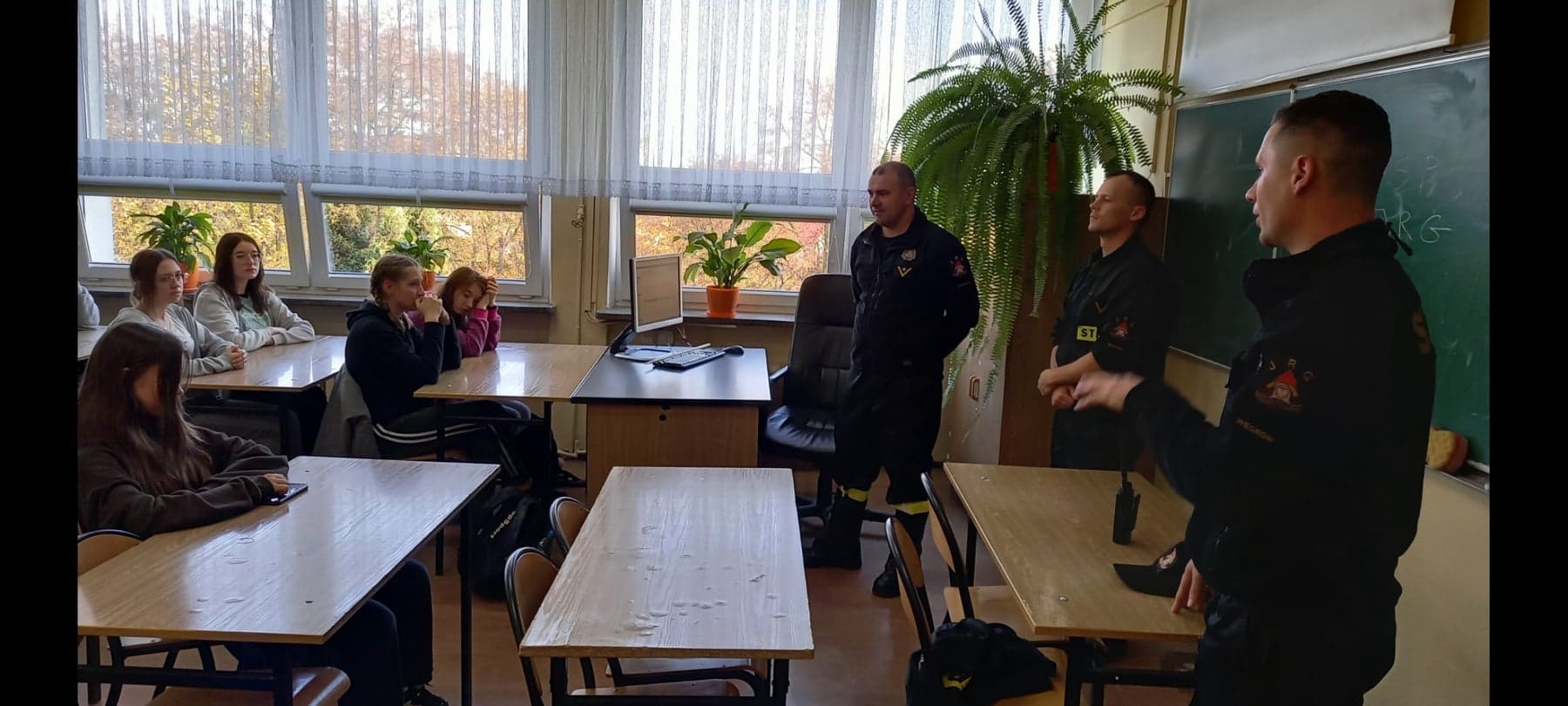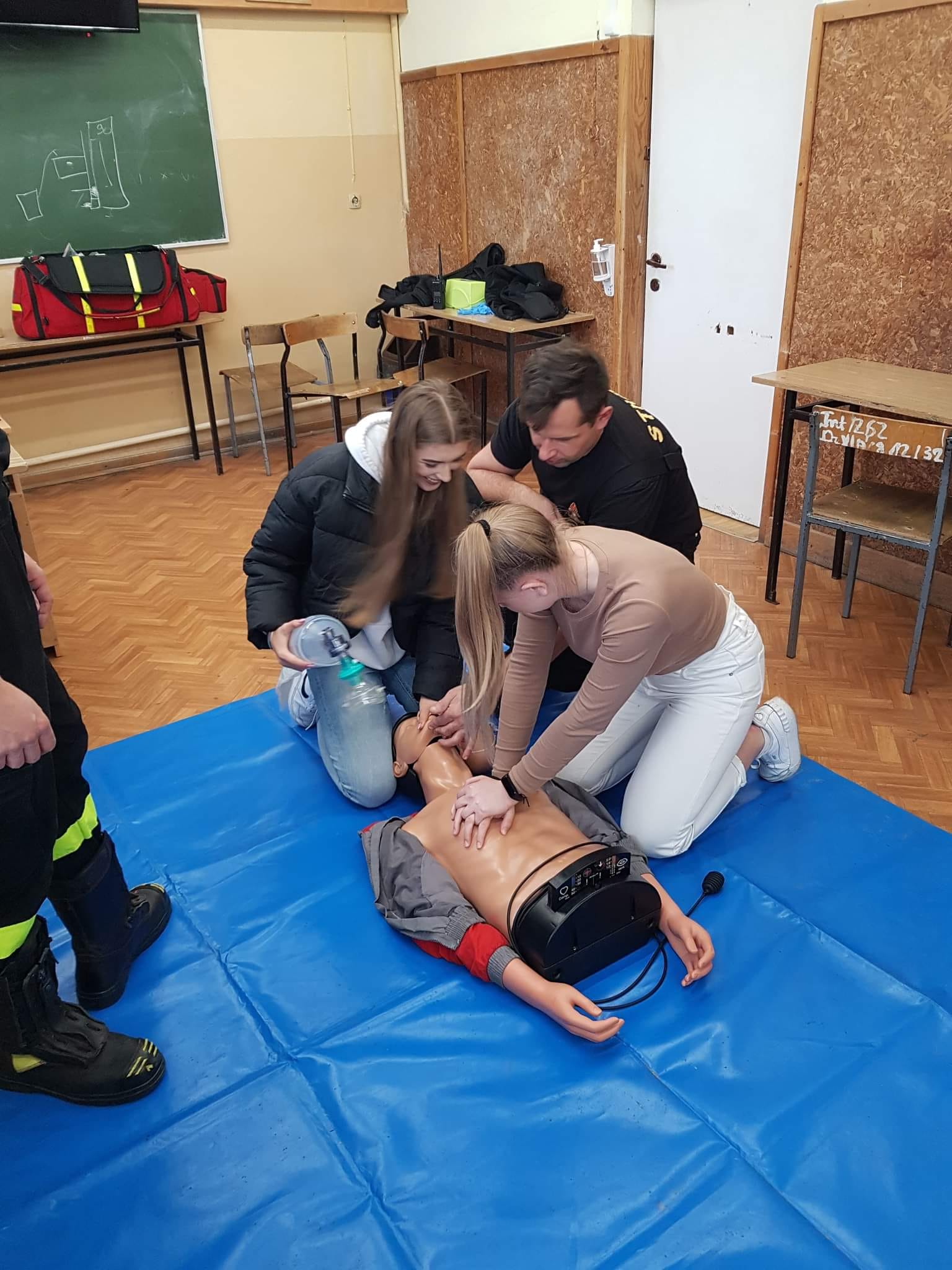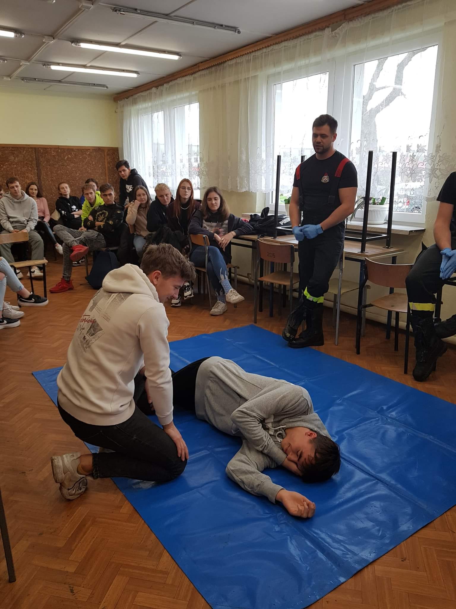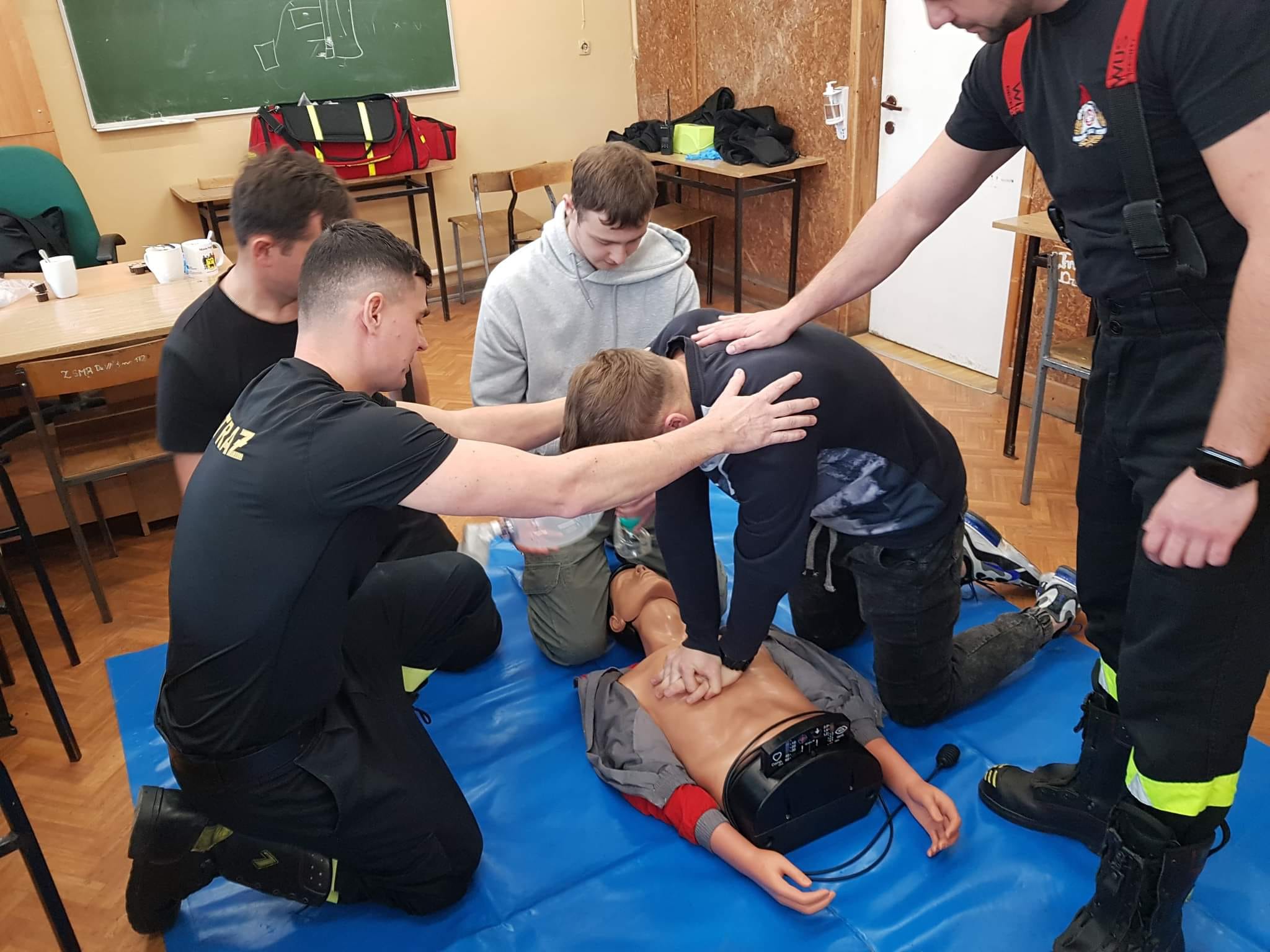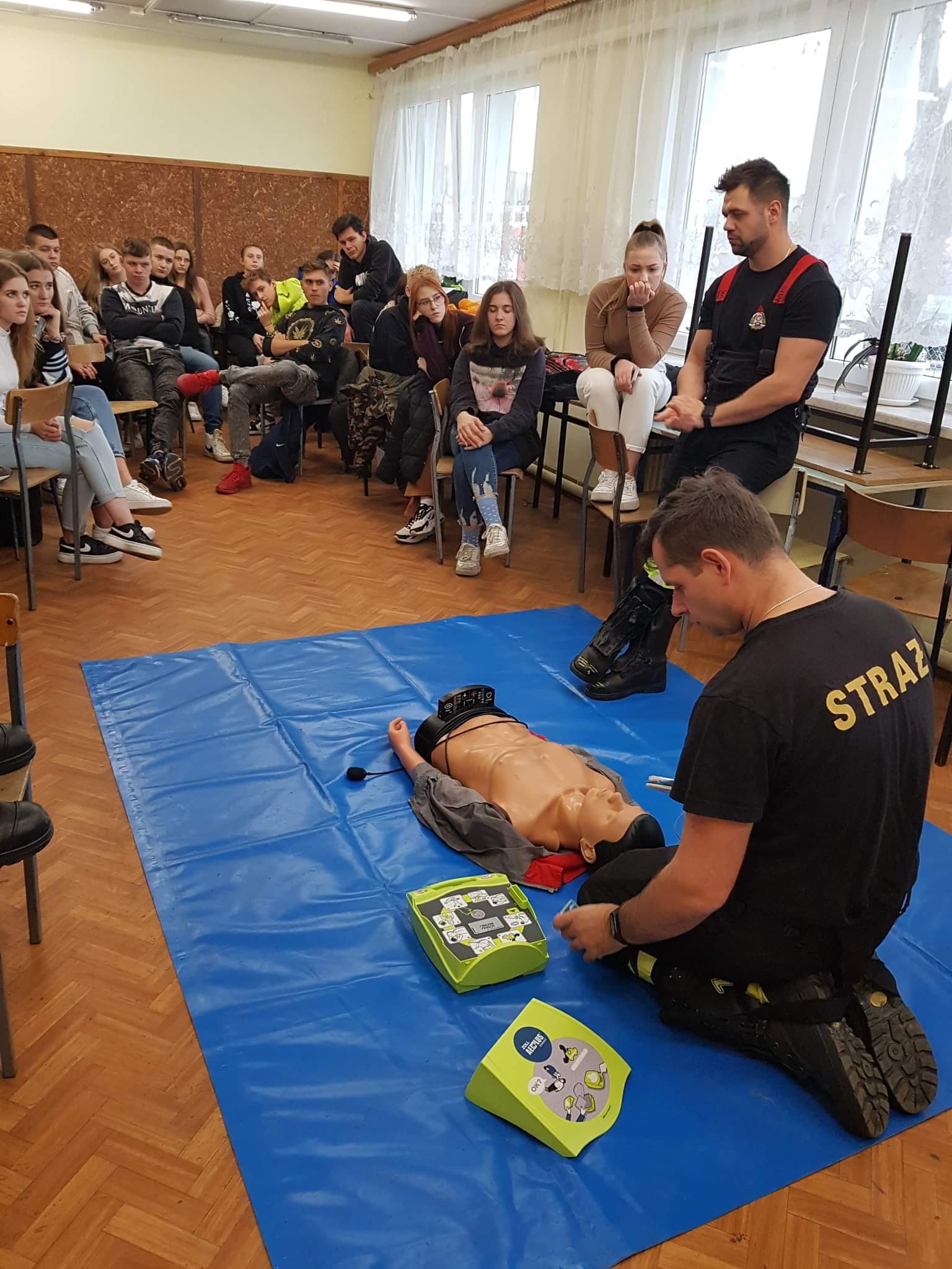 W dniach 27 października i 16 listopada na zaproszenie nauczycieli z Zespołu Szkół Ponadpodstawowych im. Jana Kochanowskiego w Węgrowie funkcjonariusze z tutejszej Komendy Powiatowej PSP gościli na zajęciach lekcyjnych w klasie IV LOp i II ek. Podczas spotkań zapoznano młodzież z procedurami z zakresu KPP, uczniowie mogli przećwiczyć resuscytację krążeniowo-oddechową na fantomie oraz treningowym AED. Strażacy opowiedzieli o swojej pracy oraz przedstawili ścieżkę rozwoju zawodowego i kryteria, jakie trzeba spełnić, aby wstąpić w szeregi PSP. W obu lekcjach łącznie brało udział 54 uczniów i 2 opiekunów.