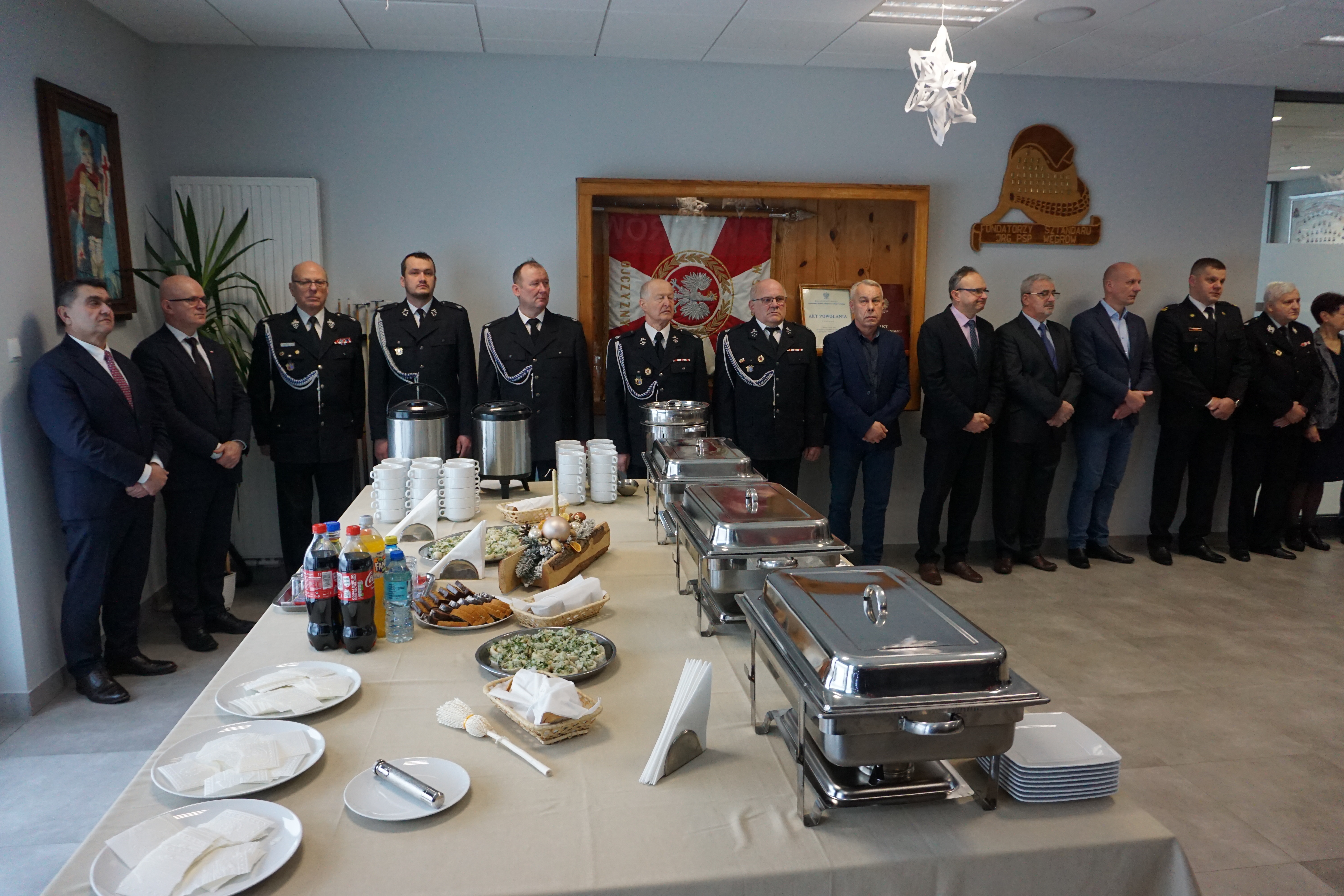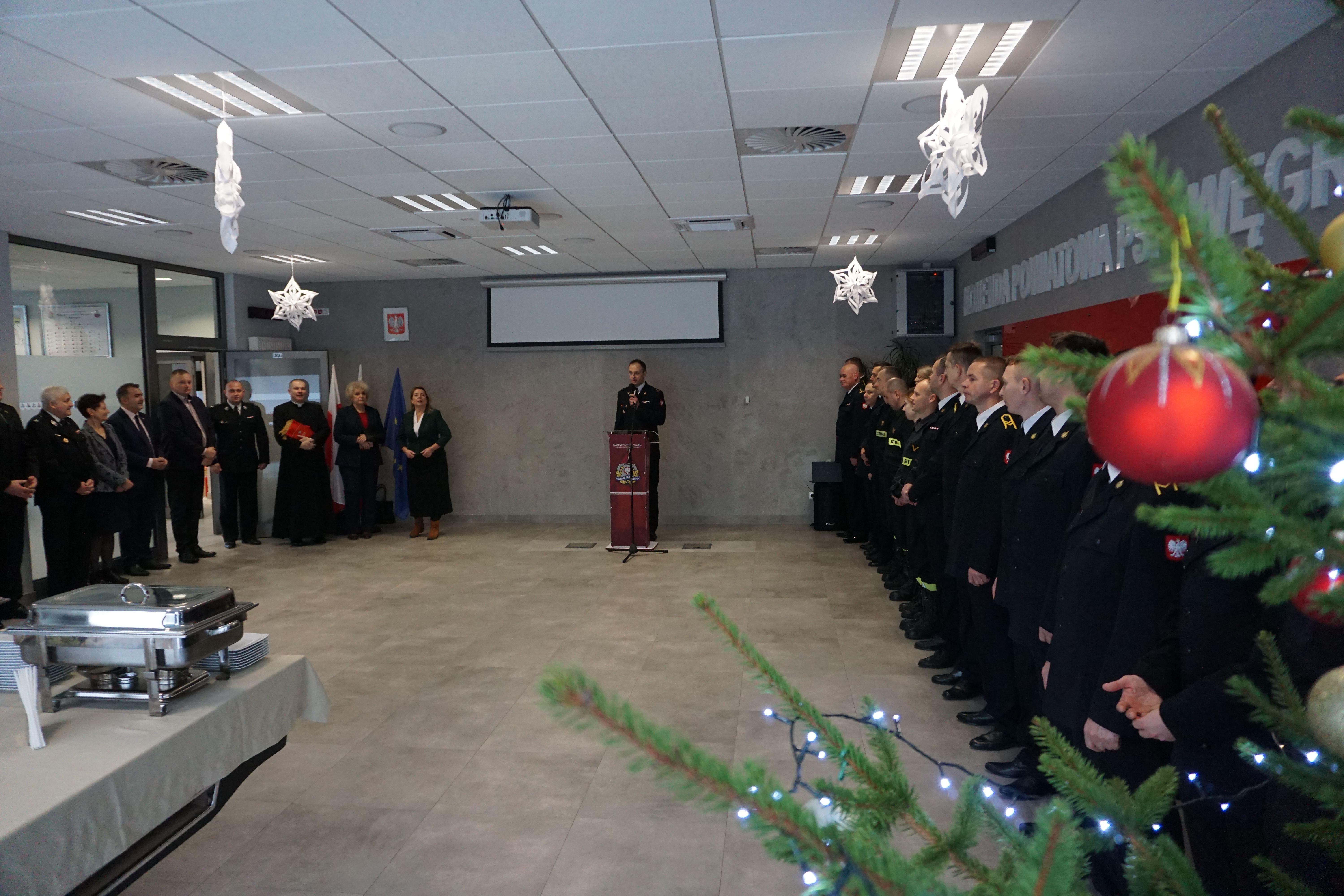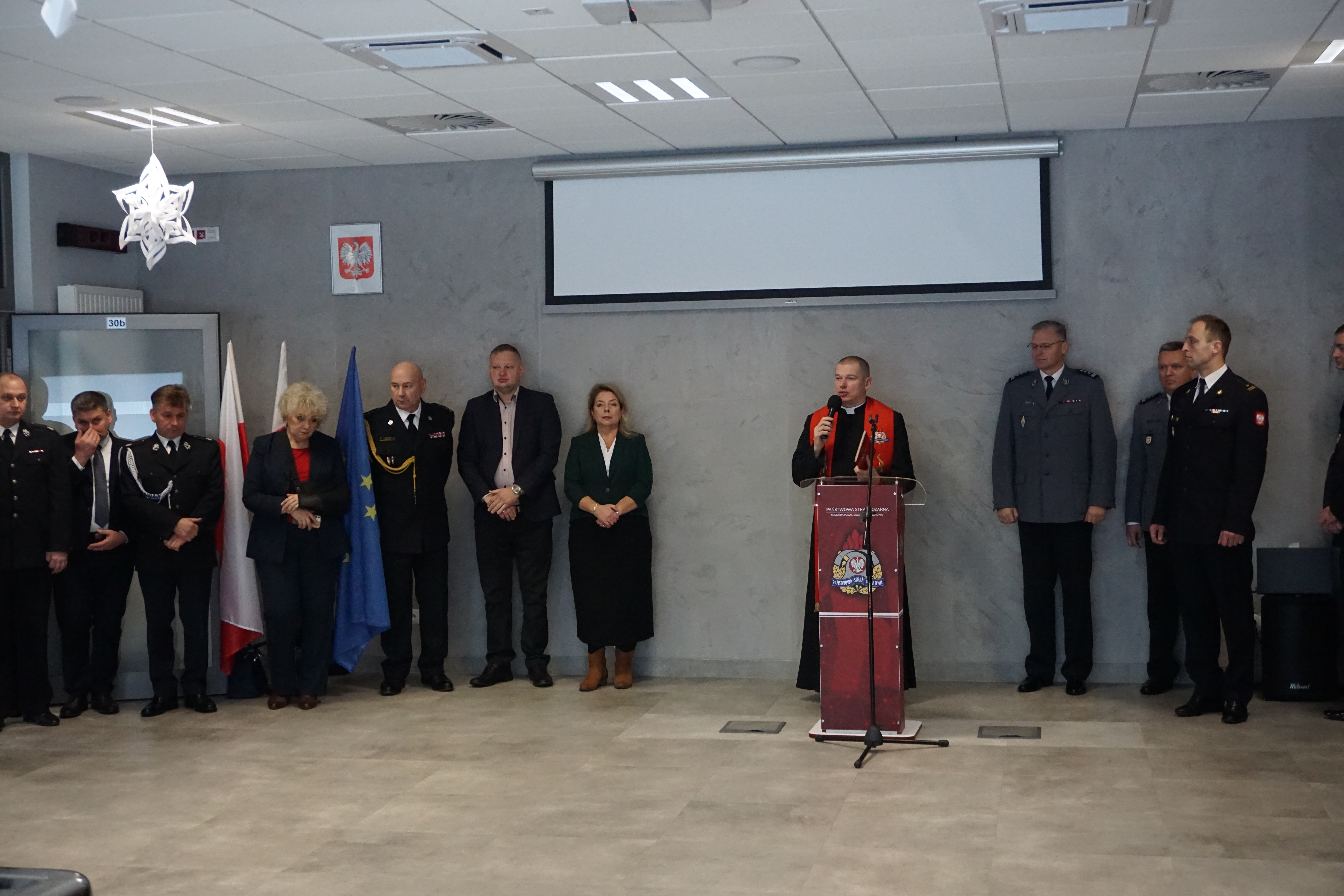 Kapelan powiatowy strażaków ks. Andrzej Falkowski odczytał fragment ewangelii o narodzeniu Jezusa, skierował do obecnych życzenia oraz pobłogosławił opłatki.