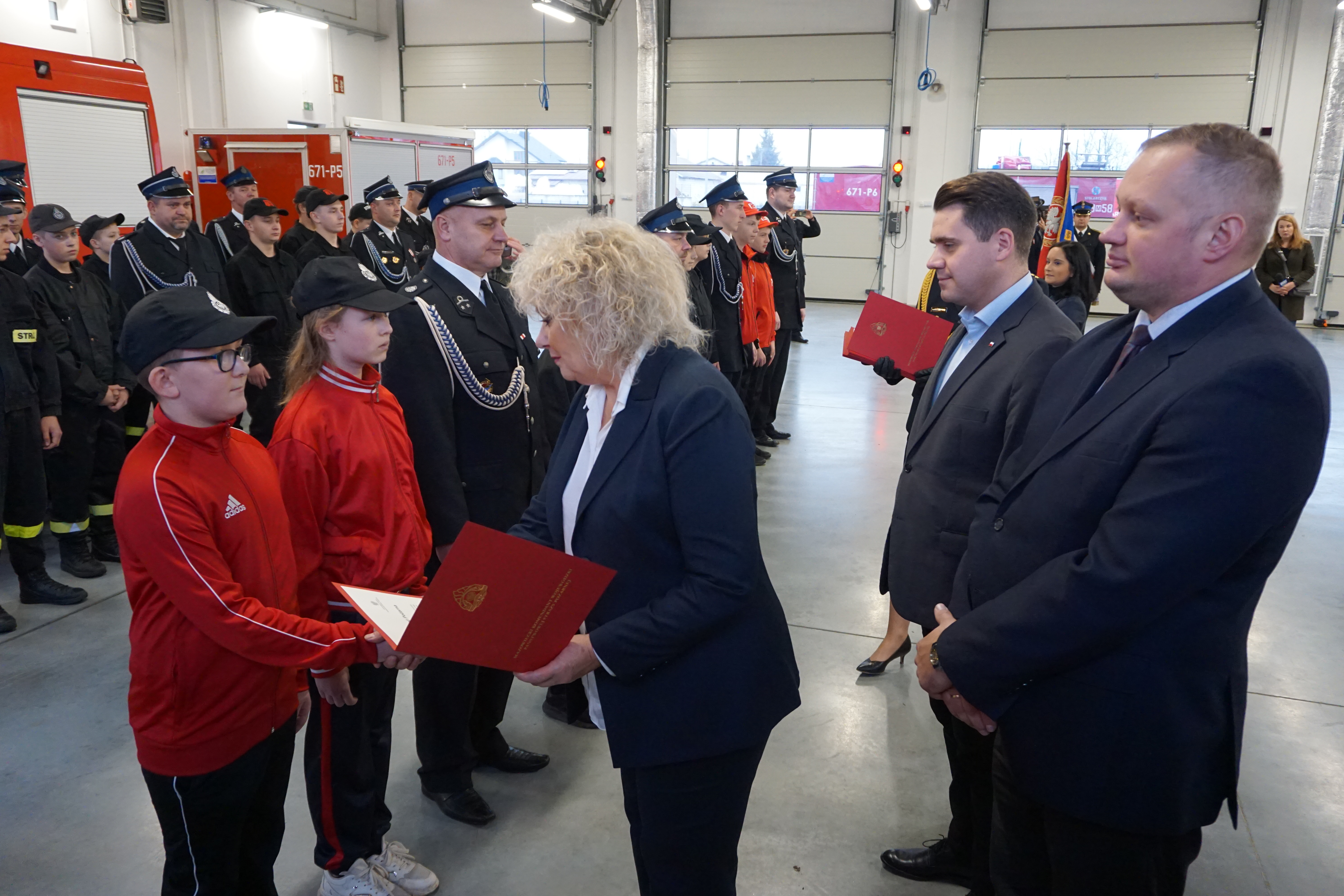 Głównym punktem uroczystej zbiórki było wręczenie 16 promes przedstawicielom Młodzieżowych Drużyn Pożarniczych. Promesy otrzymały następujące drużyny działające przy jednostkach OSP: