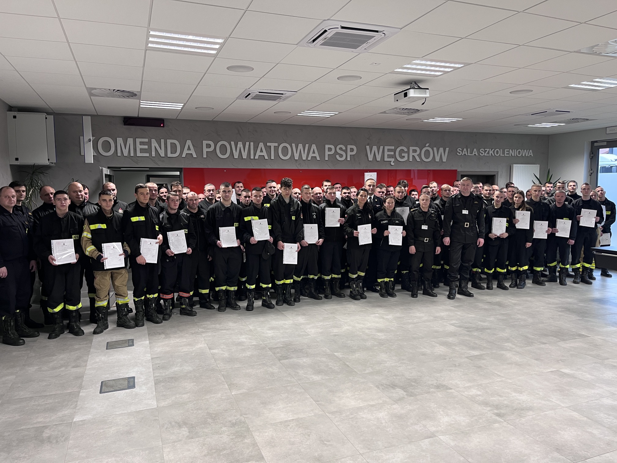 W dniu 4 grudnia 2022 r. w siedzibie Komendy Powiatowej Państwowej Straży Pożarnej w Węgrowie odbyły się egzaminy dwóch grup „Szkolenia podstawowego strażaka ratownika ochotniczych straży pożarnych.” Szkolenie podstawowe trwało od 3 września do 4 grudnia 2022 r (sobota i niedziela) w systemie stacjonarnym. Dwie grupy łącznie liczyło 80 druhów z czego 79 druhów zaliczyło egzamin z wynikiem pozytywnym. Po zakończeniu egzaminów Komendant Powiatowy Państwowej Straży Pożarnej w Węgrowie pogratulował druhom życząc kolejnych sukcesów oraz wręczył zaświadczenia potwierdzające ukończenie szkolenia podstawowego i zdania egzaminu.