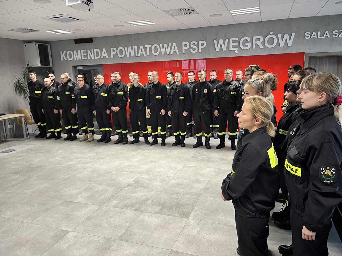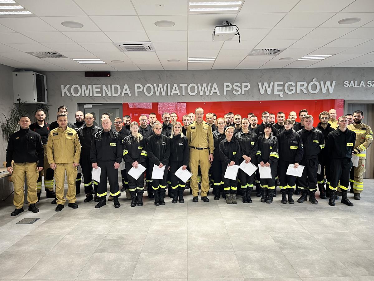 W dniach 02.09.2023 r. - 19.11.2023 r. w Komendzie Powiatowej Państwowej Straży Pożarnej w Węgrowie odbywało się "Szkolenie podstawowe strażaka ratownika OSP" wg. programu szkolenia z dnia 11.09.2023 r. Do szkolenia przystąpiło 40 słuchaczy, którzy w kolejnych dniach zdobywali wiedzę i umiejętności do przejścia m.in. komory dymowej oraz podejścia do egzaminu końcowego z różnych dziedzin ratownictwa. Do egzaminu teoretycznego i praktycznego w dniu 19.11.2023 r. przystapiło 39 słuchaczy, którzy egzamin zaliczyli z wynikiem pozytywnym.