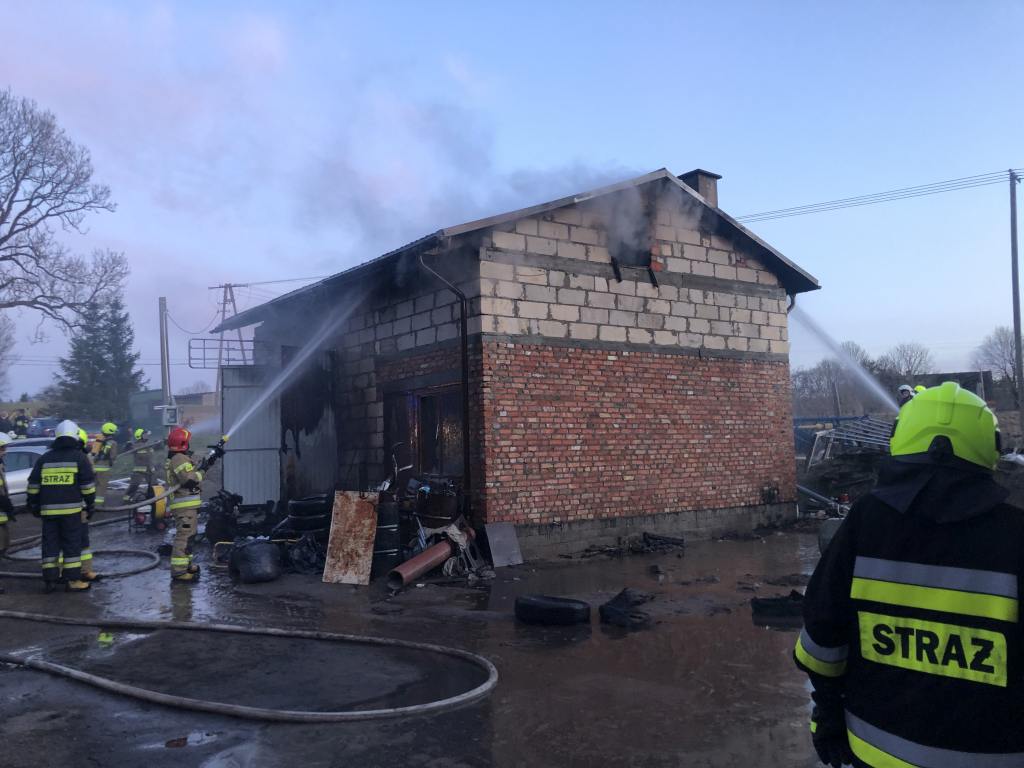 Na miejscu zdarzenia ratownicy zastali rozwinięty pożar budynku o powierzchni około 50 mkw. Pierwsze działania strażaków polegały na zabezpieczeniu miejsca zdarzenia, ustaleniu czy są osoby poszkodowane i rozpoczęciu działań gaśniczych. Po przyjeździe kolejnych zastępów pożar udało się opanować a następnie ugasić. Po ugaszeniu pożaru strażacy zabezpieczyli znajdujące się w ponieszczeniu butle z gazami technicznymi i sprawdzili pogorzelisko w celu wyeleminowania zarzewi ognia. W zdarzeniu nikt nie został poszkodowany, spaleniu uległ pojazd osobowy, budynek wraz z wyposażeniem warsztatowym. Na miejscu pożaru swoje czynności służbowe prowadzili również funkcjonariusze Policji.