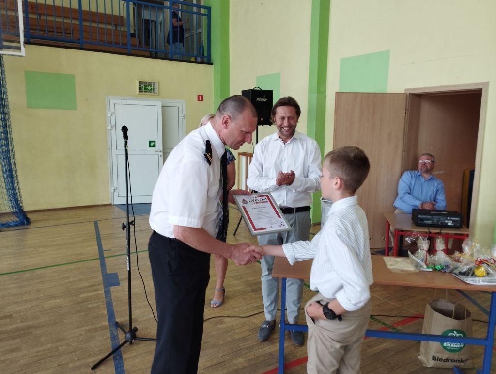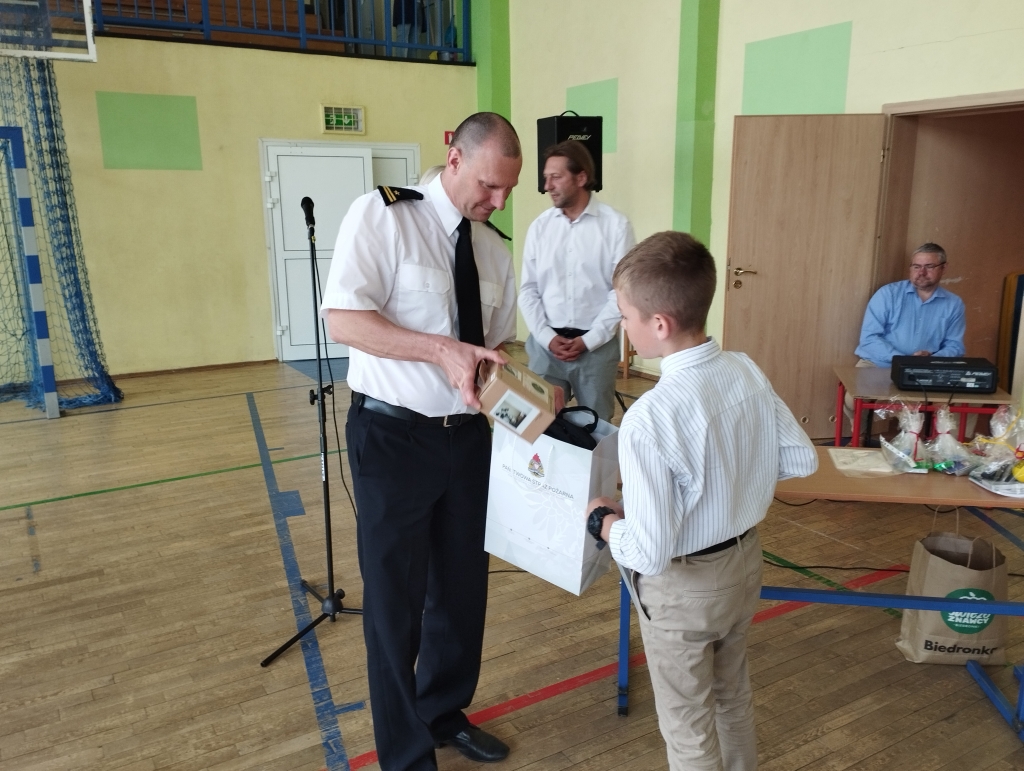 22 czerwca 2022 roku Zastępca Komendanta Powiatowego PSP w Wejherowie mł. bryg. Marek Lniski podczas uroczystego apelu w Zespole Szkolno-Przedszkolnym w Strzebielenie przekazał nagrodę Komendanta Głównego Państwowej Straży Pożarnej gen. brygadiera Andrzeja Bartkowiaka za zajęcie 3 miejsca w indywidualnym konkursie kalendarzowym PSP 2022.