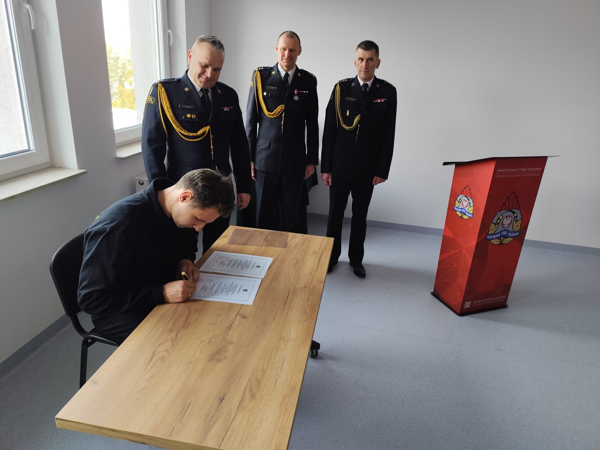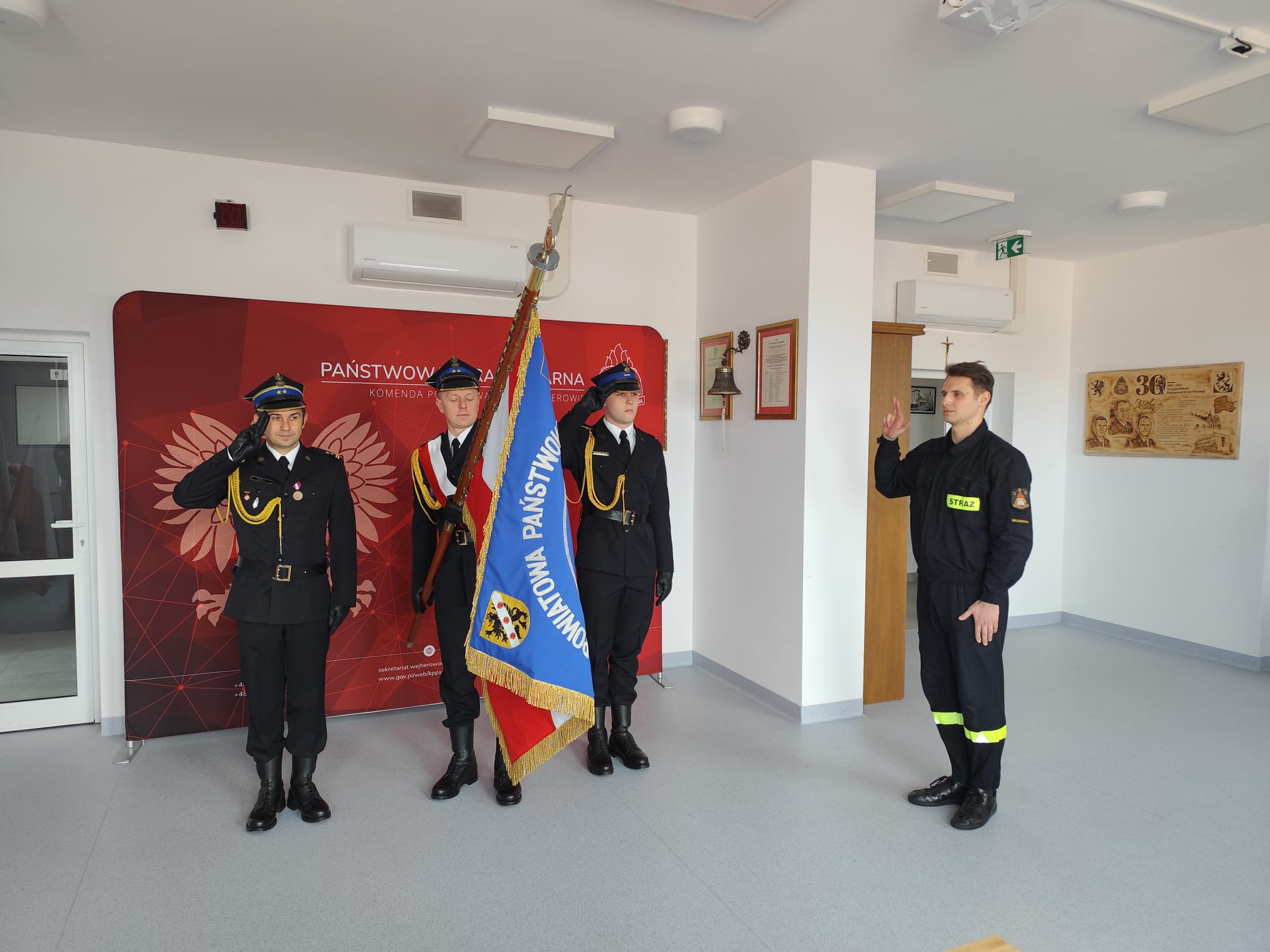 20 LUTEGO 2026 roku w siedzibie Komendy Powiatowej PSP w Wejherowie odbyła się uroczysta zbiórka z okazji złożenia ślubowania przez nowo przyjętego do służby funkcjonariusza. Rotę ślubowania przyjął komendant powiatowy PSP w Wejherowie mł. bryg. Krzysztof Chlebicki. Wręczając akt ślubowania życzył wielu sukcesów wstępującemu w szeregi Państwowej Straży Pożarnej funkcjonariuszowi.