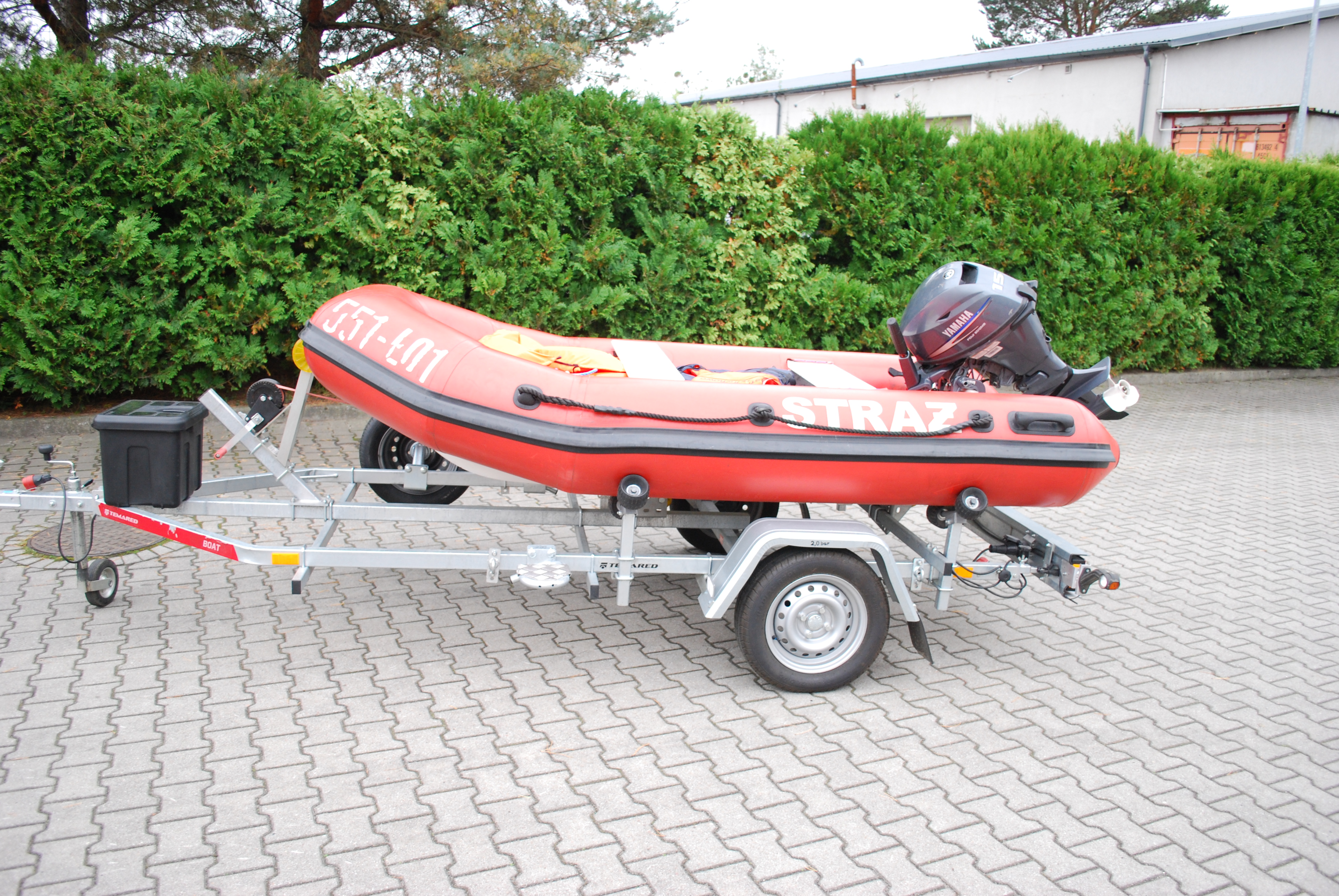 Przyczepa z łodzią hybrydową wyposażoną w silnik spalinowy, dodatkowo wyposażenie do ratownictwa wodnego. Sprzęt ten wykorzystujemy przy działaniach ratowniczych na dużych akwenach wodnych na terenie powiatu.